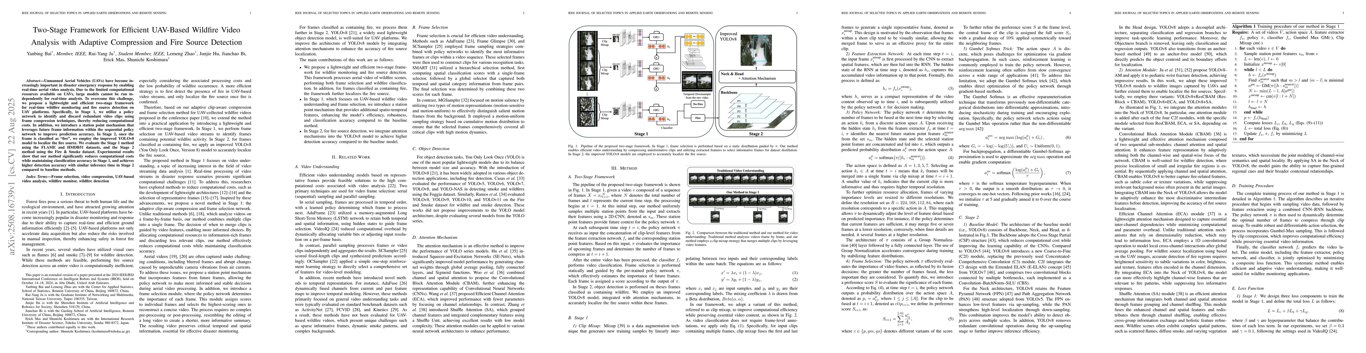 Unmanned Aerial Vehicles (UAVs) have become increasingly important in disaster emergency response by enabling real-time aerial video analysis. Due to the limited computational resources available on UAVs, large models cannot be run independently for real-time analysis. To overcome this challenge, we propose a lightweight and efficient two-stage framework for real-time wildfire monitoring and fire source detection on UAV platforms. Specifically, in Stage 1, we utilize a policy network to identify and discard redundant video clips using frame compression techniques, thereby reducing computational costs. In addition, we introduce a station point mechanism that leverages future frame information within the sequential policy network to improve prediction accuracy. In Stage 2, once the frame is classified as "fire", we employ the improved YOLOv8 model to localize the fire source. We evaluate the Stage 1 method using the FLAME and HMDB51 datasets, and the Stage 2 method using the Fire & Smoke dataset. Experimental results show that our method significantly reduces computational costs while maintaining classification accuracy in Stage 1, and achieves higher detection accuracy with similar inference time in Stage 2 compared to baseline methods.