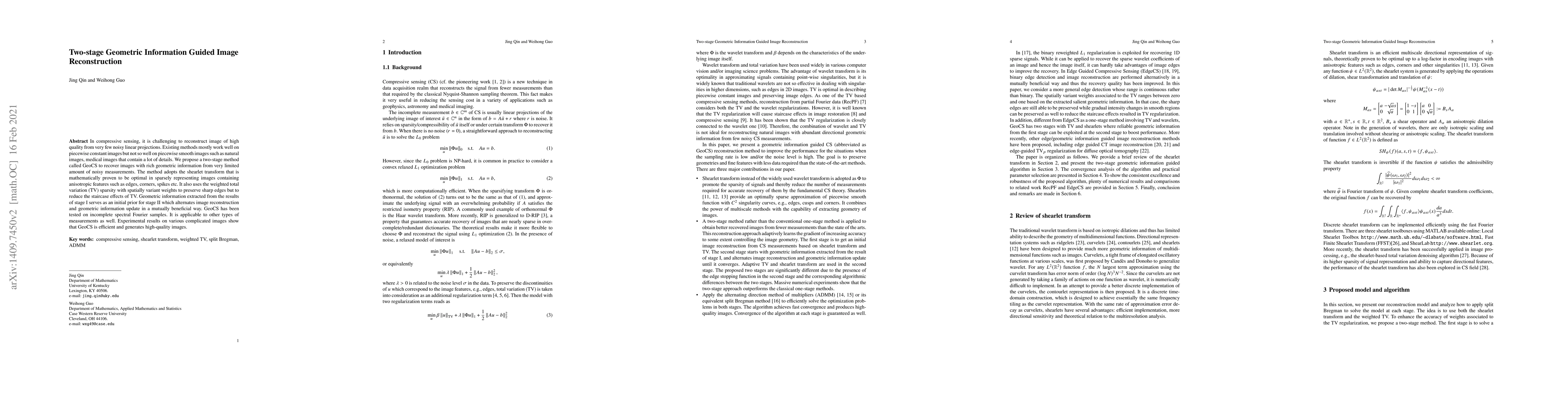 In compressive sensing, it is challenging to reconstruct image of high quality from very few noisy linear projections. Existing methods mostly work well on piecewise constant images but not so well on piecewise smooth images such as natural images, medical images that contain a lot of details. We propose a two-stage method called GeoCS to recover images with rich geometric information from very limited amount of noisy measurements. The method adopts the shearlet transform that is mathematically proven to be optimal in sparsely representing images containing anisotropic features such as edges, corners, spikes etc. It also uses the weighted total variation (TV) sparsity with spatially variant weights to preserve sharp edges but to reduce the staircase effects of TV. Geometric information extracted from the results of stage I serves as an initial prior for stage II which alternates image reconstruction and geometric information update in a mutually beneficial way. GeoCS has been tested on incomplete spectral Fourier samples. It is applicable to other types of measurements as well. Experimental results on various complicated images show that GeoCS is efficient and generates high-quality images.