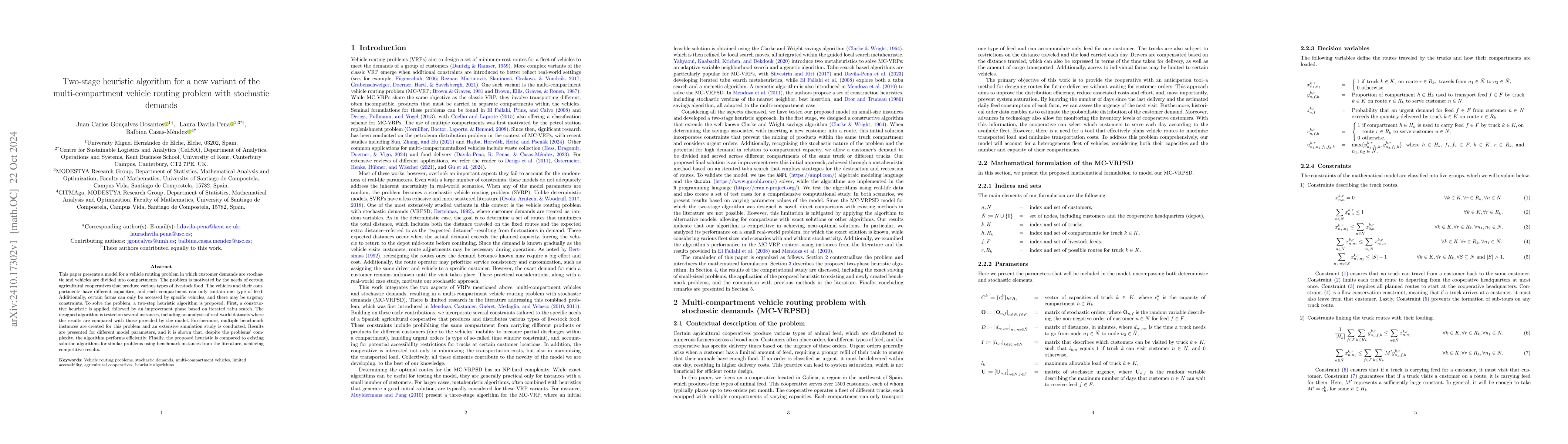 This paper presents a model for a vehicle routing problem in which customer demands are stochastic and vehicles are divided into compartments. The problem is motivated by the needs of certain agricultural cooperatives that produce various types of livestock food. The vehicles and their compartments have different capacities, and each compartment can only contain one type of feed. Additionally, certain farms can only be accessed by specific vehicles, and there may be urgency constraints. To solve the problem, a two-step heuristic algorithm is proposed. First, a constructive heuristic is applied, followed by an improvement phase based on iterated tabu search. The designed algorithm is tested on several instances, including an analysis of real-world datasets where the results are compared with those provided by the model. Furthermore, multiple benchmark instances are created for this problem and an extensive simulation study is conducted. Results are presented for different model parameters, and it is shown that, despite the problems' complexity, the algorithm performs efficiently. Finally, the proposed heuristic is compared to existing solution algorithms for similar problems using benchmark instances from the literature, achieving competitive results.