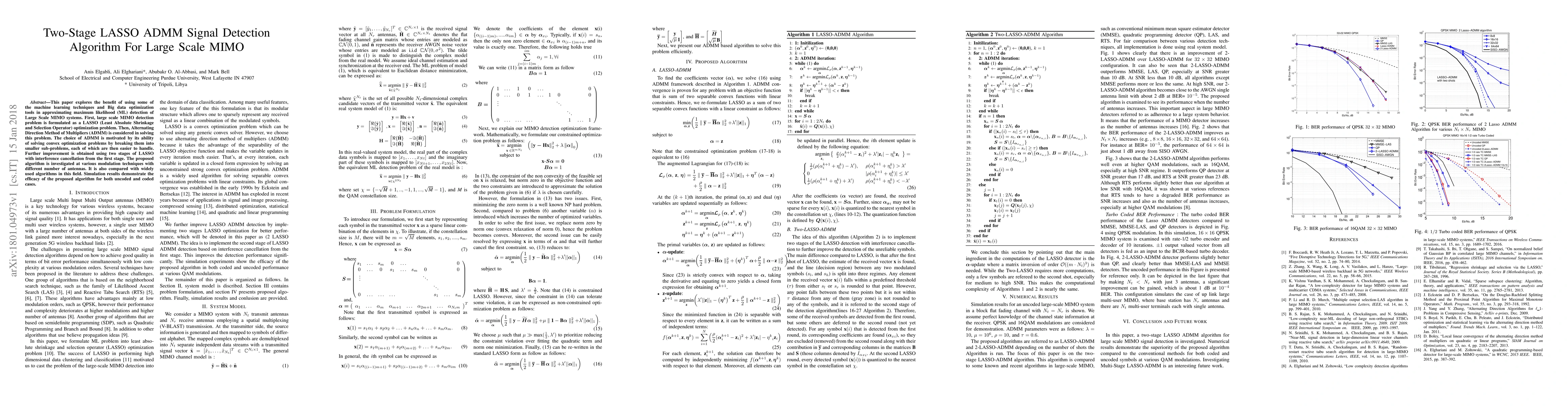 This paper proposes a two-stage LASSO ADMM algorithm for maximum likelihood detection in large scale MIMO systems, leveraging machine learning and optimization techniques. Simulation results show improved performance over existing methods across various modulation techniques and antenna configurations.