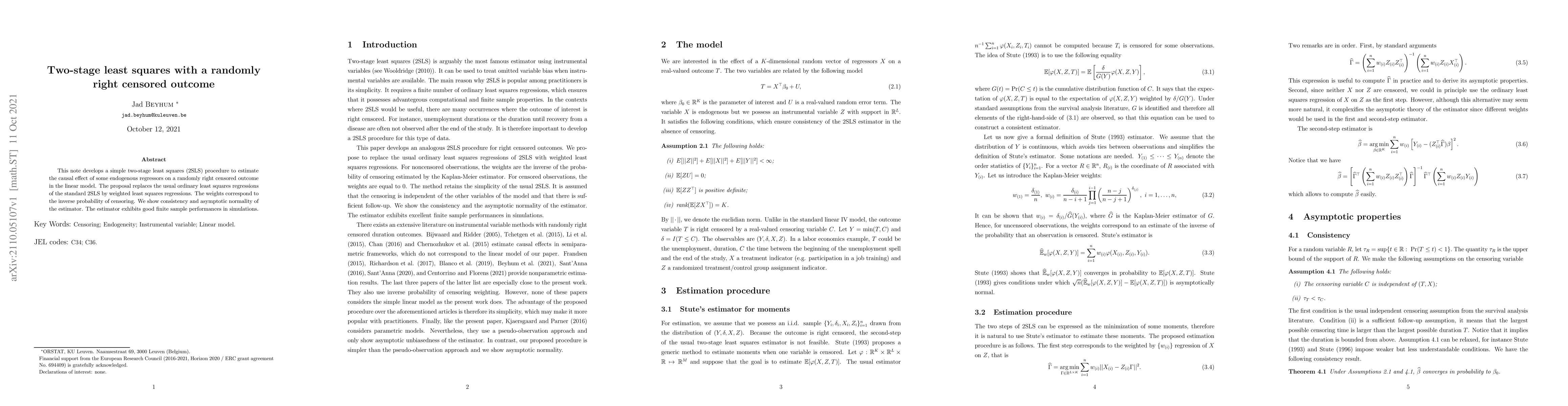 This paper proposes a modified two-stage least squares (2SLS) method to estimate causal effects on a randomly right-censored outcome, using weighted least squares with weights based on the inverse probability of censoring. The method demonstrates consistency, asymptotic normality, and good performance in simulations.