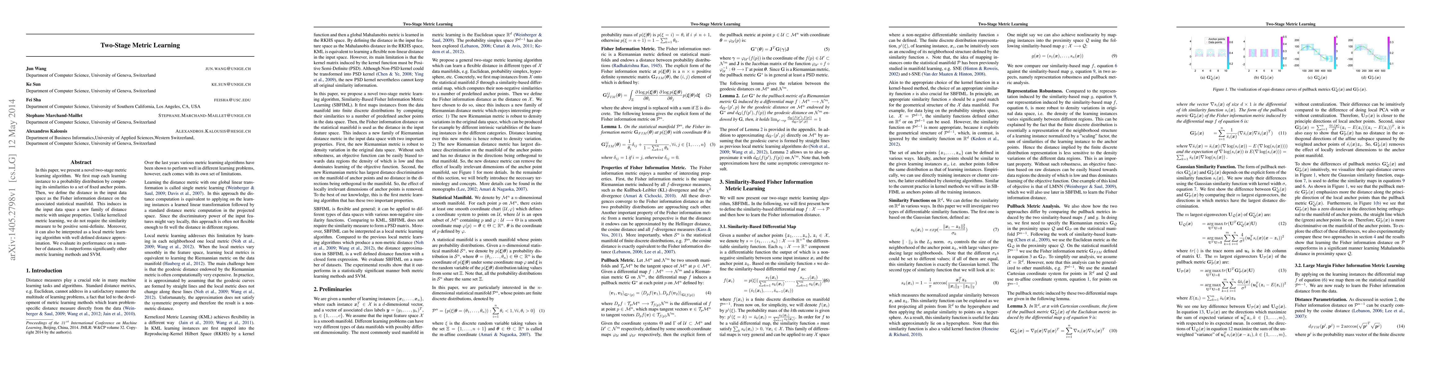 In this paper, we present a novel two-stage metric learning algorithm. We first map each learning instance to a probability distribution by computing its similarities to a set of fixed anchor points. Then, we define the distance in the input data space as the Fisher information distance on the associated statistical manifold. This induces in the input data space a new family of distance metric with unique properties. Unlike kernelized metric learning, we do not require the similarity measure to be positive semi-definite. Moreover, it can also be interpreted as a local metric learning algorithm with well defined distance approximation. We evaluate its performance on a number of datasets. It outperforms significantly other metric learning methods and SVM.