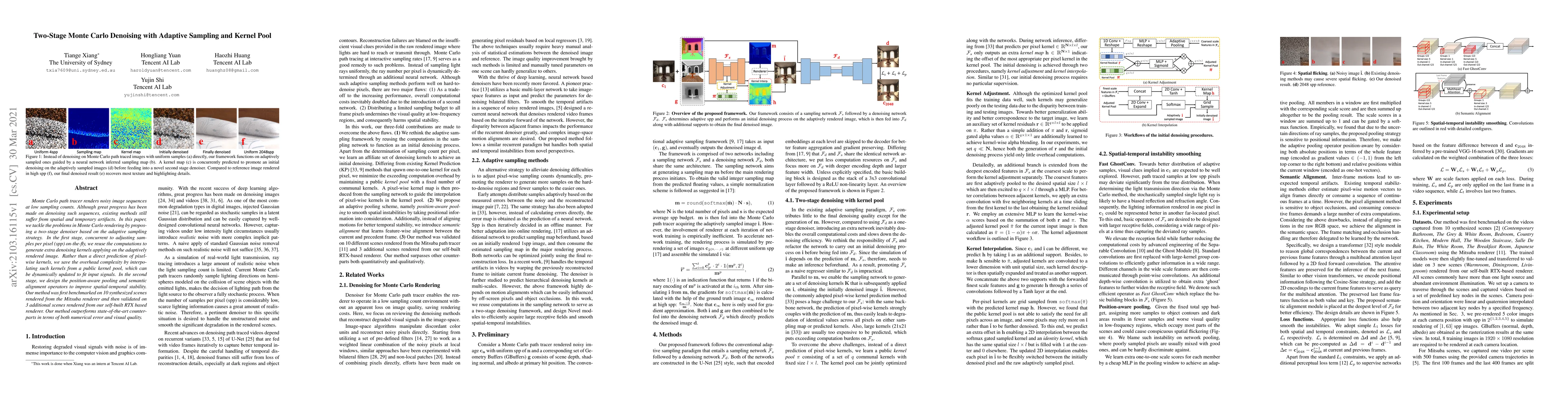This paper proposes a two-stage Monte Carlo denoiser with adaptive sampling and kernel pool to reduce noise in low-sample renders, achieving better spatial-temporal stability and outperforming existing methods in both numerical error and visual quality. The method leverages adaptive sampling and kernel interpolation from a dynamic kernel pool to enhance denoising efficiency.