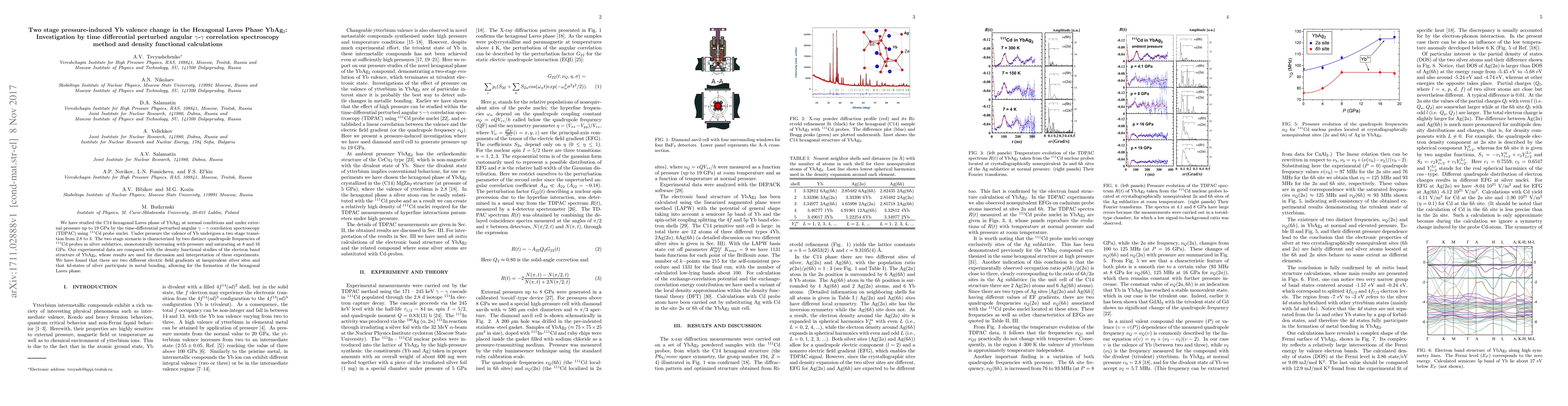 We have studied the C14 hexagonal Laves phase of YbAg$_2$ at normal conditions and under external pressure up to 19 GPa by the time-differential perturbed angular $\gamma-\gamma$ correlation spectroscopy (TDPAC) using $^{111}$Cd probe nuclei. Under pressure the valence of Yb undergoes a two stage transition from 2.8 to 3. The two stage scenario is characterized by two distinct quadrupole frequencies of $^{111}$Cd probes in silver sublattice, monotonically increasing with pressure and saturating at 8 and 16 GPa. Our experimental data are compared with the density functional studies of the electron band structure of YbAg$_2$, whose results are used for discussion and interpretation of these experiments. We have found that there are two different electric field gradients at inequivalent silver sites and that $4d$-states of silver participate in metal bonding, allowing for the formation of the hexagonal Laves phase.