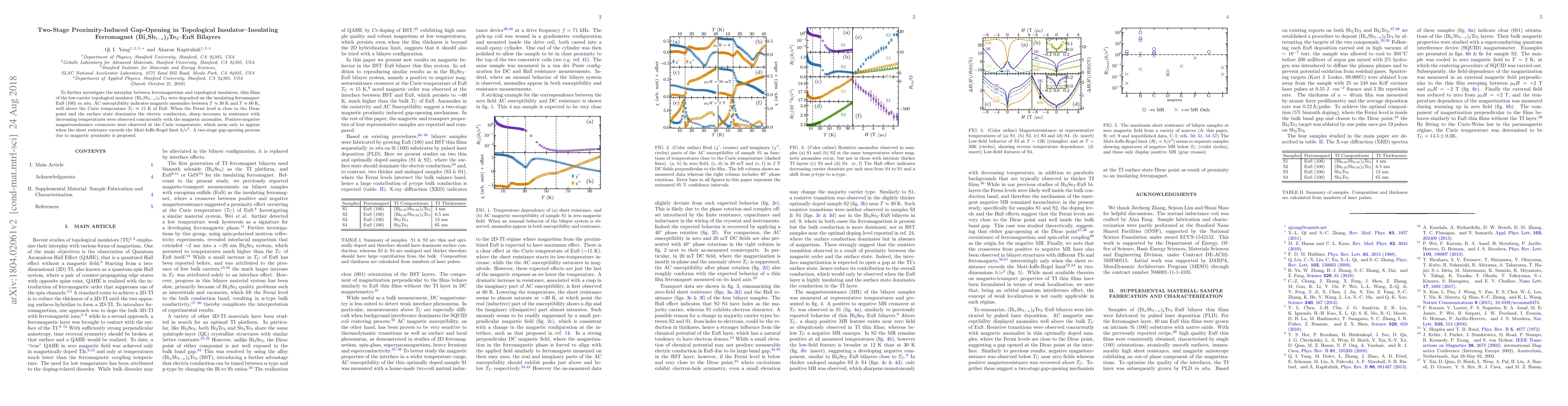To further investigate the interplay between ferromagnetism and topological insulators, thin films of the low-carrier topological insulator (Bi$_x$Sb$_{1-x}$)$_2$Te$_3$ were deposited on the insulating ferromagnet EuS (100) in situ. AC susceptibility indicates magnetic anomalies between $T\approx30~\mathrm{K}$ and $T\approx60~\mathrm{K}$, well above the Curie temperature $T_C \approx 15~\mathrm{K}$ of EuS. When the Fermi level is close to the Dirac point and the surface state dominates the electric conduction, sharp increases in resistance with decreasing temperatures were observed concurrently with the magnetic anomalies. Positive-negative magnetoresistance crossovers were observed at the Curie temperature, which seem only to appear when the sheet resistance exceeds the Mott-Ioffe-Regel limit $h/e^2$. A two-stage gap-opening process due to magnetic proximity is proposed.