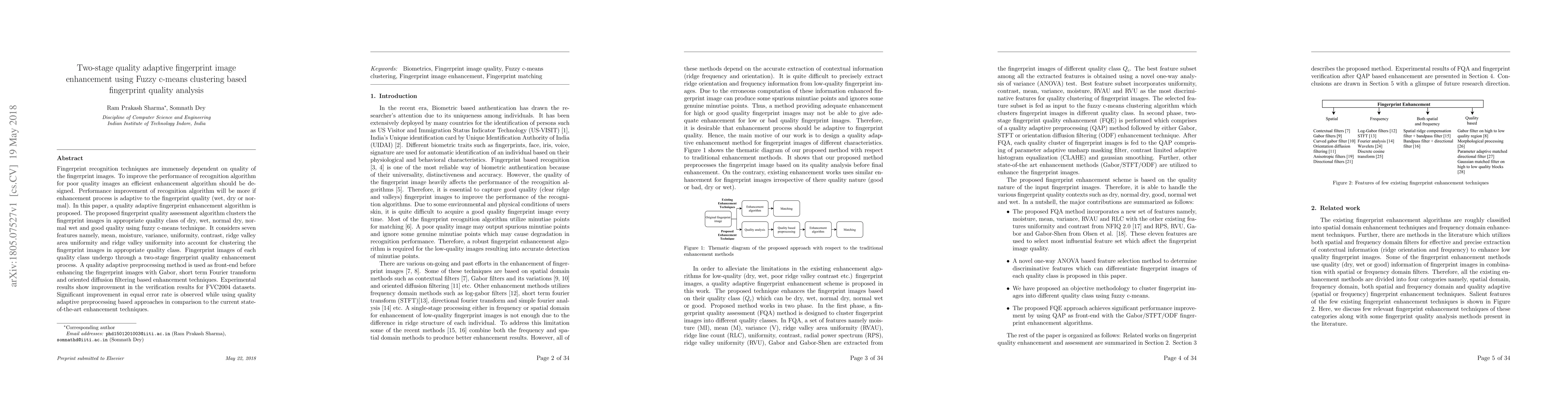 This paper proposes a two-stage adaptive fingerprint enhancement algorithm using a fuzzy c-means clustering technique for quality assessment, followed by preprocessing and advanced filtering methods. Experimental results show significant improvement in recognition accuracy for poor quality images compared to existing methods.