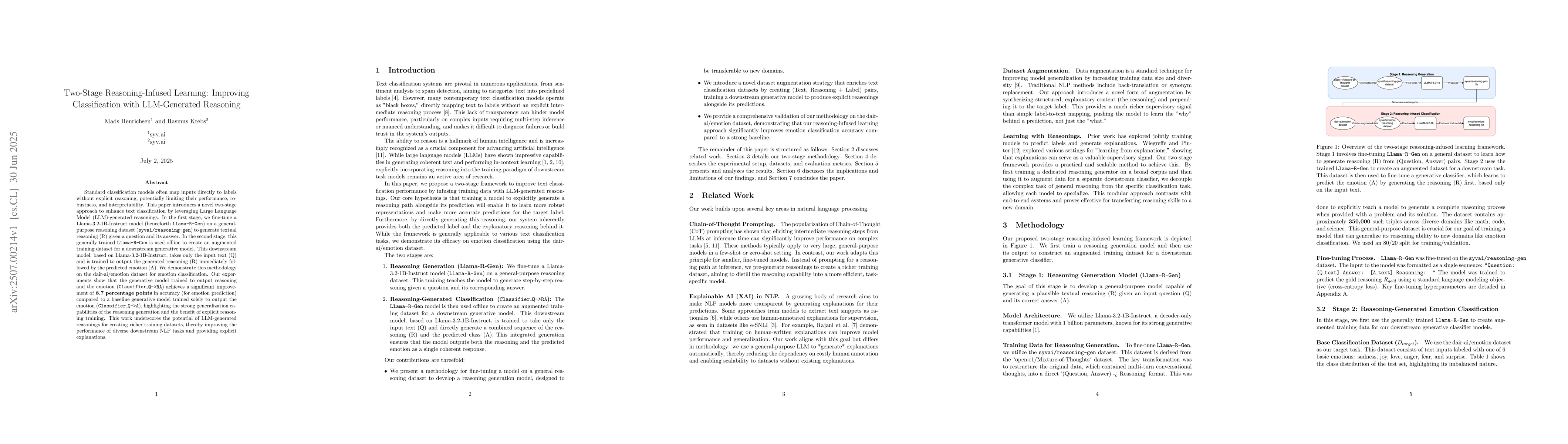 Standard classification models often map inputs directly to labels without explicit reasoning, potentially limiting their performance, robustness, and interpretability. This paper introduces a novel two-stage approach to enhance text classification by leveraging Large Language Model (LLM)-generated reasonings. In the first stage, we fine-tune a Llama-3.2-1B-Instruct model (henceforth Llama-R-Gen) on a general-purpose reasoning dataset (syvai/reasoning-gen) to generate textual reasoning (R) given a question and its answer. In the second stage, this generally trained Llama-R-Gen is used offline to create an augmented training dataset for a downstream generative model. This downstream model, based on Llama-3.2-1B-Instruct, takes only the input text (Q) and is trained to output the generated reasoning (R) immediately followed by the predicted emotion (A). We demonstrate this methodology on the dair-ai/emotion dataset for emotion classification. Our experiments show that the generative model trained to output reasoning and the emotion (Classifier Q->RA) achieves a significant improvement of 8.7 percentage points in accuracy (for emotion prediction) compared to a baseline generative model trained solely to output the emotion (Classifier Q->A), highlighting the strong generalization capabilities of the reasoning generation and the benefit of explicit reasoning training. This work underscores the potential of LLM-generated reasonings for creating richer training datasets, thereby improving the performance of diverse downstream NLP tasks and providing explicit explanations.