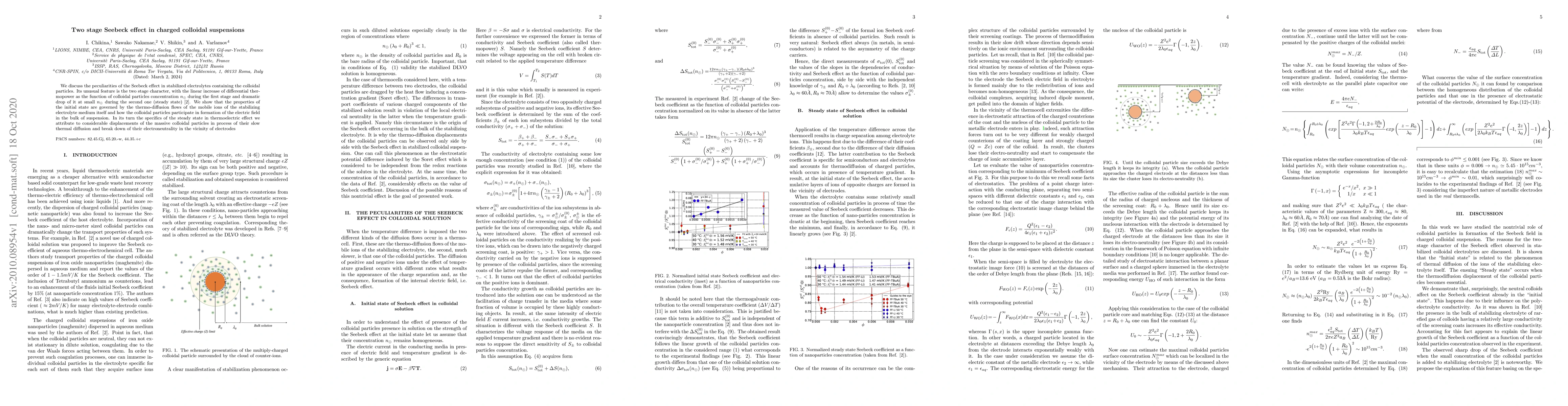 We discuss the peculiarities of the Seebeck effect in stabilized electrolytes containing the colloidal particles. Its unusual feature is the two-stage character, with the linear increase of differential thermopower as the function of colloidal particles concentration $n_{\odot}$ during the first stage and dramatic drop of it at small $n_{\odot}$ during the second one (steady state). We show that the properties of the initial state are governed by the thermo-diffusion flows of the mobile ions of the stabilizing electrolyte medium itself and how the colloidal particles participate in formation of the electric field in the bulk of suspension. In its turn the specifics of the steady state in thermoelectric effect we attribute to considerable displacements of the massive colloidal particles in process of their slow thermal diffusion and break down of their electroneutrality in the vicinity of electrodes