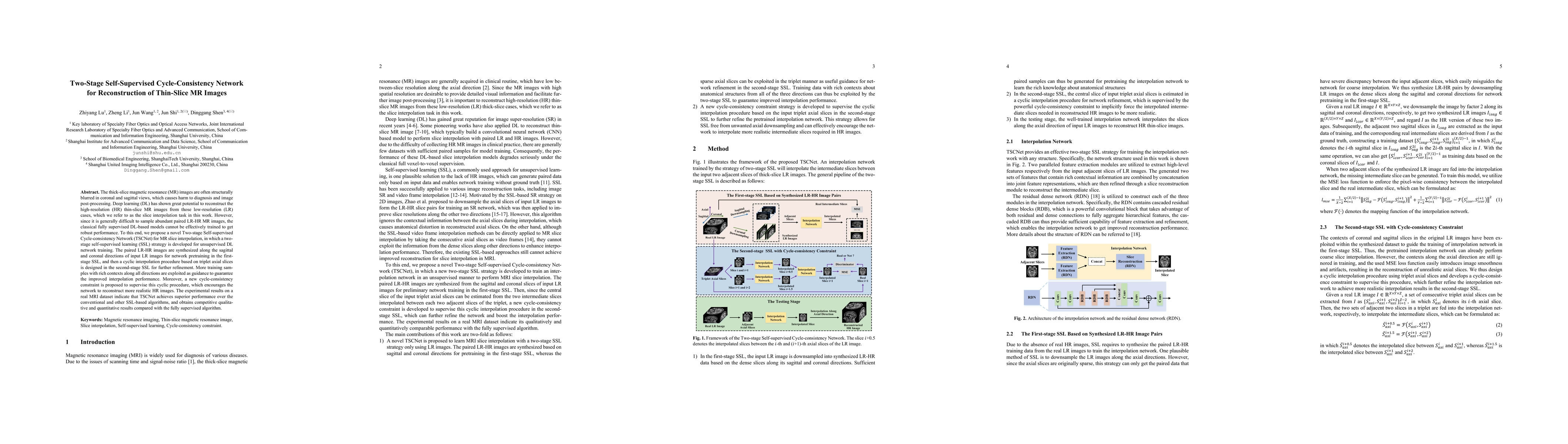 The paper proposes a Two-stage Self-supervised Cycle-consistency Network (TSCNet) for reconstructing high-resolution thin-slice MR images from low-resolution inputs using a self-supervised learning approach. The method achieves superior performance compared to conventional and other self-supervised algorithms, demonstrating improved interpolation accuracy and realistic image reconstruction.