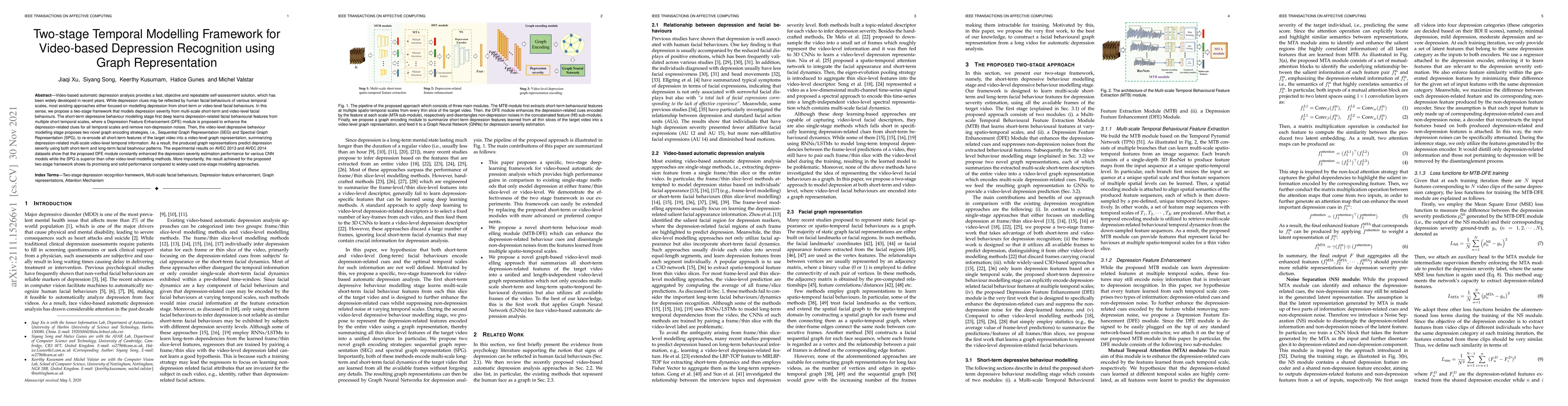 This paper proposes a two-stage framework for video-based depression recognition, enhancing short-term facial behavioural features with a Depression Feature Enhancement (DFE) module, and summarizing multi-scale temporal information using Sequential Graph Representation (SEG) and Spectral Graph Representation (SPG). Experimental results show superior performance over one-stage methods and other graph encoding strategies.