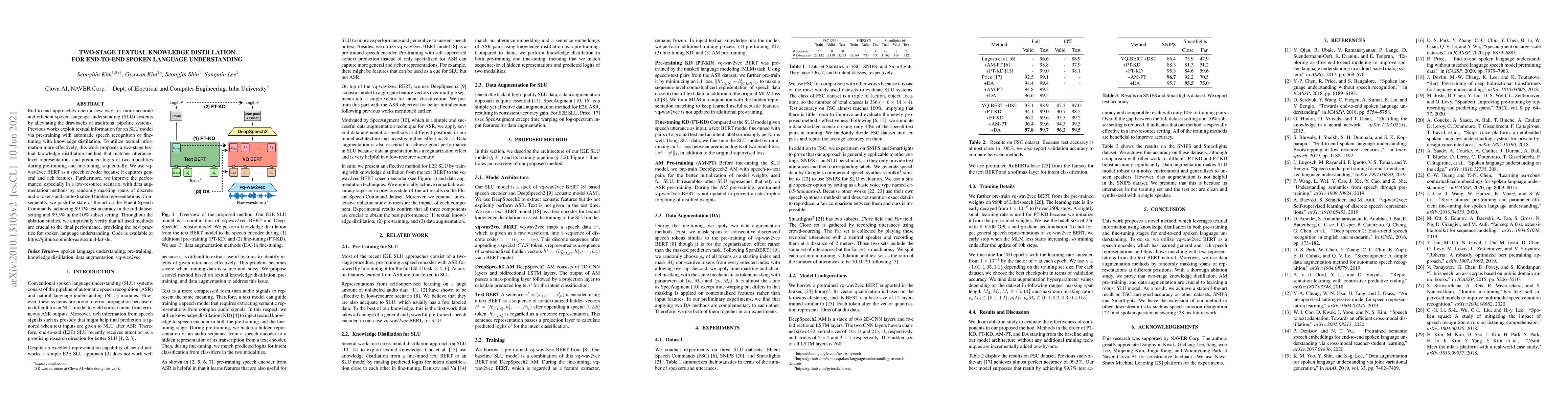 This paper proposes a two-stage textual knowledge distillation method for end-to-end spoken language understanding, achieving state-of-the-art results on the Fluent Speech Commands dataset. The method sequentially matches representations and logits during pre-training and fine-tuning, using vq-wav2vec BERT and data augmentation techniques to enhance performance.