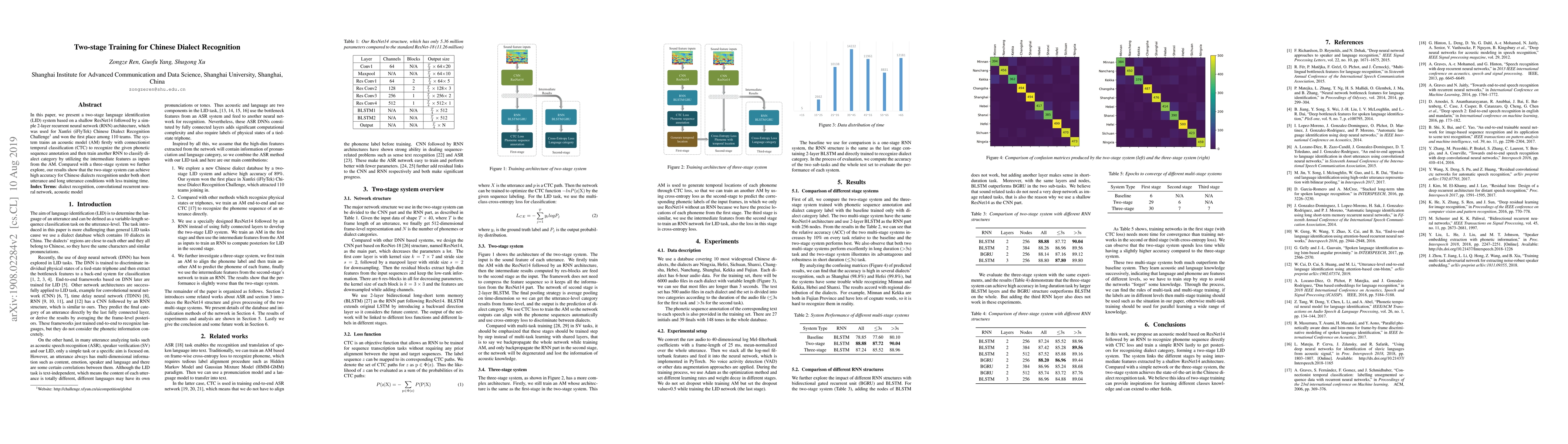 This paper presents a two-stage system that uses a shallow ResNet14 and an RNN to recognize Chinese dialects with high accuracy and less training time, outperforming a three-stage system.