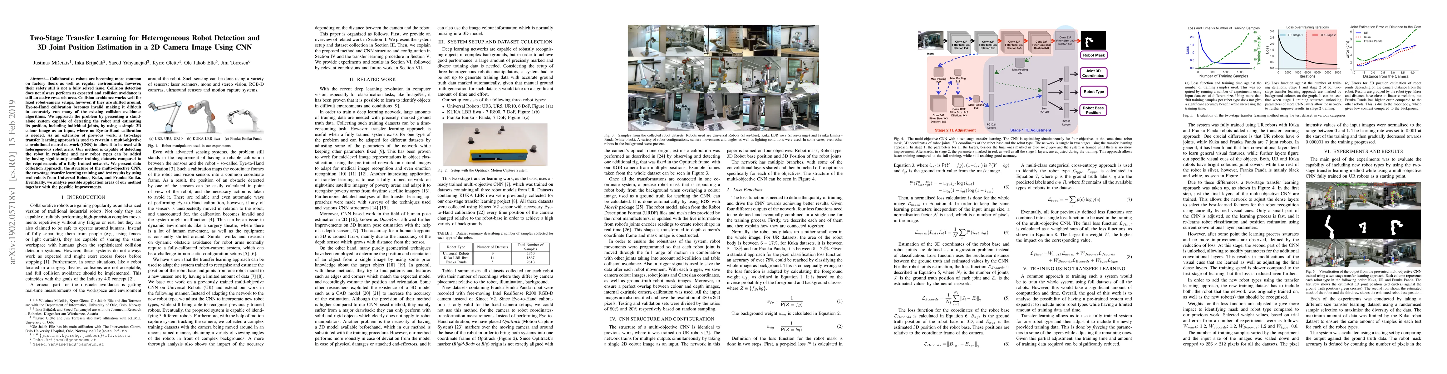 Collaborative robots are becoming more common on factory floors as well as regular environments, however, their safety still is not a fully solved issue. Collision detection does not always perform as expected and collision avoidance is still an active research area. Collision avoidance works well for fixed robot-camera setups, however, if they are shifted around, Eye-to-Hand calibration becomes invalid making it difficult to accurately run many of the existing collision avoidance algorithms. We approach the problem by presenting a stand-alone system capable of detecting the robot and estimating its position, including individual joints, by using a simple 2D colour image as an input, where no Eye-to-Hand calibration is needed. As an extension of previous work, a two-stage transfer learning approach is used to re-train a multi-objective convolutional neural network (CNN) to allow it to be used with heterogeneous robot arms. Our method is capable of detecting the robot in real-time and new robot types can be added by having significantly smaller training datasets compared to the requirements of a fully trained network. We present data collection approach, the structure of the multi-objective CNN, the two-stage transfer learning training and test results by using real robots from Universal Robots, Kuka, and Franka Emika. Eventually, we analyse possible application areas of our method together with the possible improvements.