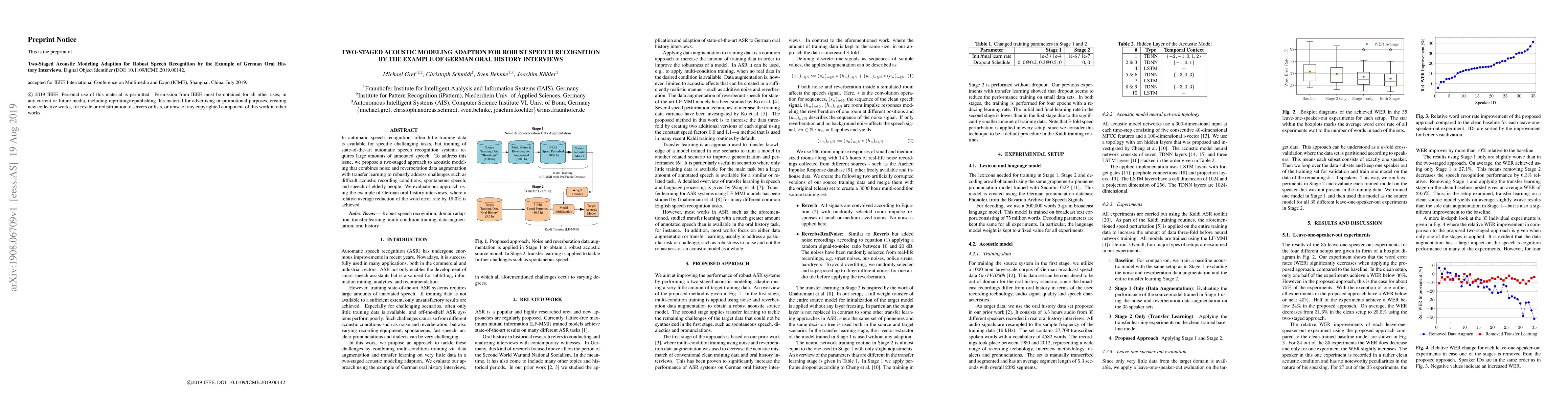 This paper proposes a two-staged acoustic modeling approach for robust speech recognition, combining data augmentation and transfer learning to tackle challenges in specific tasks with limited training data. The method is evaluated on German oral history interviews, achieving a 19.3% reduction in word error rate.