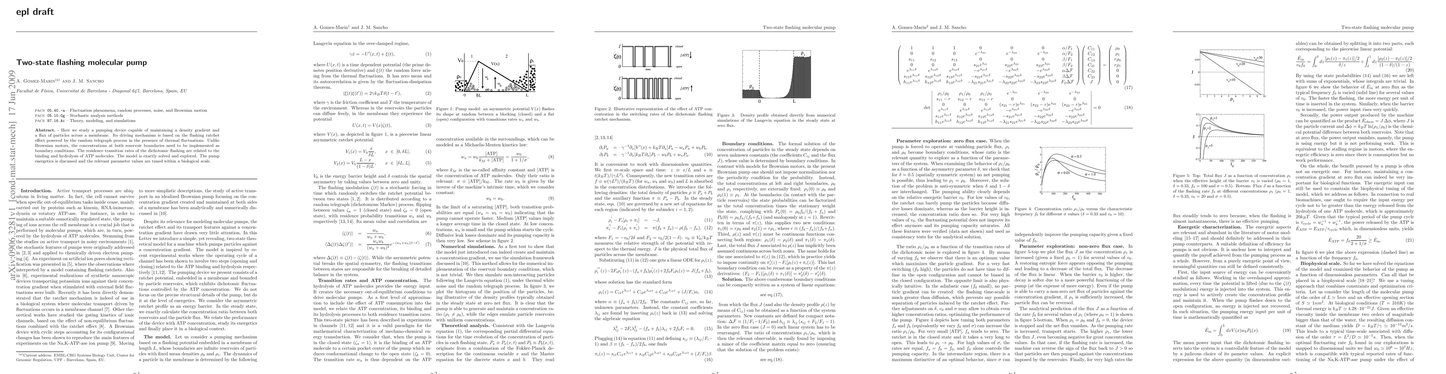Here we study a pumping device capable of maintaining a density gradient and a flux of particles across a membrane. Its driving mechanism is based on the flashing ratchet effect powered by the random telegraph process in the presence of thermal fluctuations. Unlike Brownian motors, the concentrations at both reservoir boundaries need to be implemented as boundary conditions. The residence transition rates of the dichotomic flashing are related to the binding and hydrolysis of ATP molecules. The model is exactly solved and explored. The pump energetics is discussed and the relevant parameter values are tuned within a biological scale.