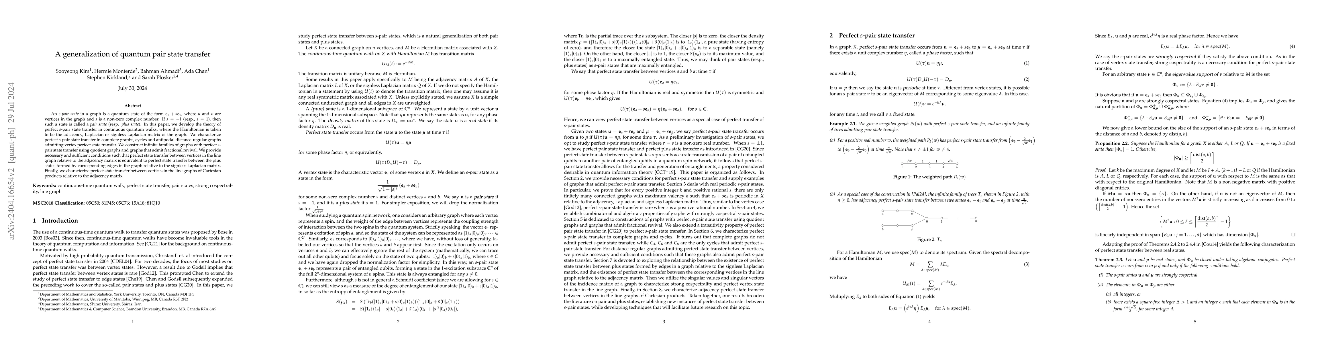 This paper generalizes quantum state transfer to "two-state" transfers within quantum spin networks, encompassing pair and plus states. It investigates conditions for perfect state transfer (PST) using spectral properties of Hamiltonians like adjacency, Laplacian, and signless Laplacian matrices, and provides conditions for PST in complete graphs, cycles, hypercubes, and beyond.