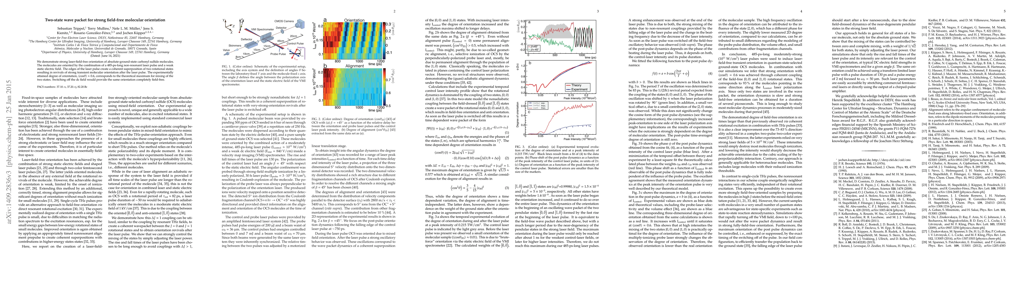 This paper demonstrates strong field-free orientation of carbonyl sulfide molecules using a 485-ps non-resonant laser pulse and a weak static electric field, achieving a theoretical maximum orientation degree of 0.6. The laser pulse induces a coherent superposition of two rotational states, resulting in transient molecular orientation revivals.