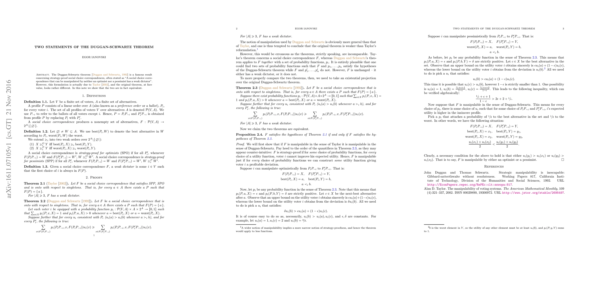 The Duggan-Schwartz theorem (Duggan and Schwartz, 1992) is a famous result concerning strategy-proof social choice correspondences, often stated as "A social choice correspondence that can be manipulated by neither an optimist nor a pessimist has a weak dictator". However, this formulation is actually due to Taylor (2002), and the original theorem, at face value, looks rather different. In this note we show that the two are in fact equivalent.