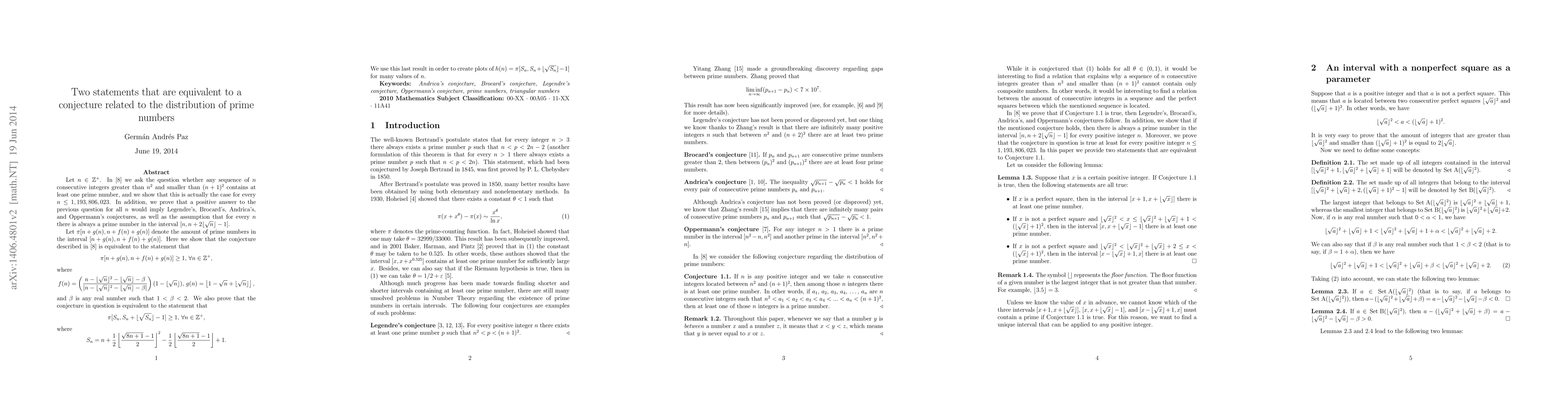 Let $n\in\mathbb{Z}^+$. In [8] we ask the question whether any sequence of $n$ consecutive integers greater than $n^2$ and smaller than $(n+1)^2$ contains at least one prime number, and we show that this is actually the case for every $n\leq 1,193,806,023$. In addition, we prove that a positive answer to the previous question for all $n$ would imply Legendre's, Brocard's, Andrica's, and Oppermann's conjectures, as well as the assumption that for every $n$ there is always a prime number in the interval $[n,n+2\lfloor\sqrt{n}\rfloor-1]$. Let $\pi[n+g(n),n+f(n)+g(n)]$ denote the amount of prime numbers in the interval $[n+g(n),n+f(n)+g(n)]$. Here we show that the conjecture described in [8] is equivalent to the statement that $$\pi[n+g(n),n+f(n)+g(n)]\ge 1\text{, }\forall n\in\mathbb{Z}^+\text{,}$$ where $$f(n)=\left(\frac{n-\lfloor\sqrt{n}\rfloor^2-\lfloor\sqrt{n}\rfloor-\beta}{|n-\lfloor\sqrt{n}\rfloor^2-\lfloor\sqrt{n}\rfloor-\beta|}\right)(1-\lfloor\sqrt{n}\rfloor)\text{, }g(n)=\left\lfloor1-\sqrt{n}+\lfloor\sqrt{n}\rfloor\right\rfloor\text{,}$$ and $\beta$ is any real number such that $1<\beta<2$. We also prove that the conjecture in question is equivalent to the statement that $$\pi[S_n,S_n+\lfloor\sqrt{S_n}\rfloor-1]\ge 1\text{, }\forall n\in\mathbb{Z}^+\text{,}$$ where $$S_n=n+\frac{1}{2}\left\lfloor\frac{\sqrt{8n+1}-1}{2}\right\rfloor^2-\frac{1}{2}\left\lfloor\frac{\sqrt{8n+1}-1}{2}\right\rfloor+1\text{.}$$ We use this last result in order to create plots of $h(n)=\pi[S_n,S_n+\lfloor\sqrt{S_n}\rfloor-1]$ for many values of $n$.