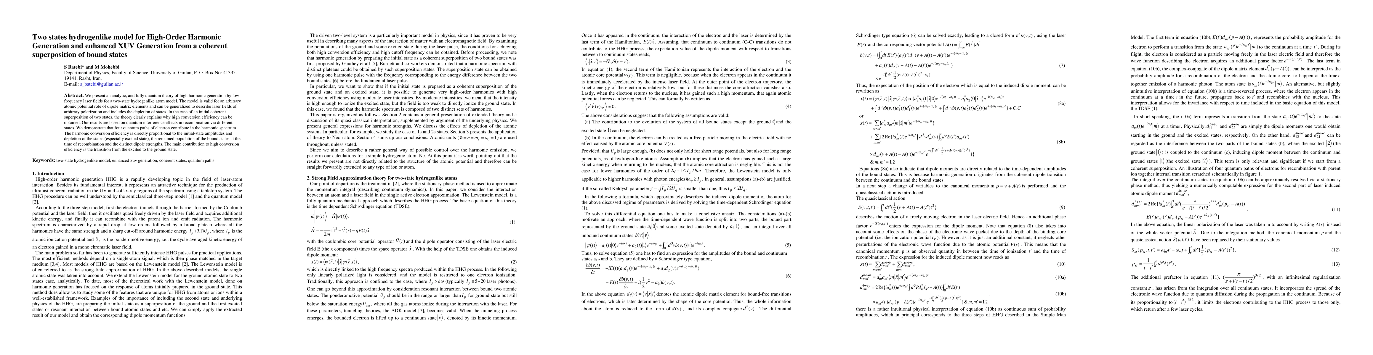 This research develops a quantum theory for high harmonic generation in hydrogenlike atoms under low-frequency laser fields, explaining enhanced XUV generation through coherent superposition of bound states. The model highlights quantum interference effects and identifies four contributing electron paths, linking harmonic efficiency to initial state amplitudes, state depletion, and dipole strengths.