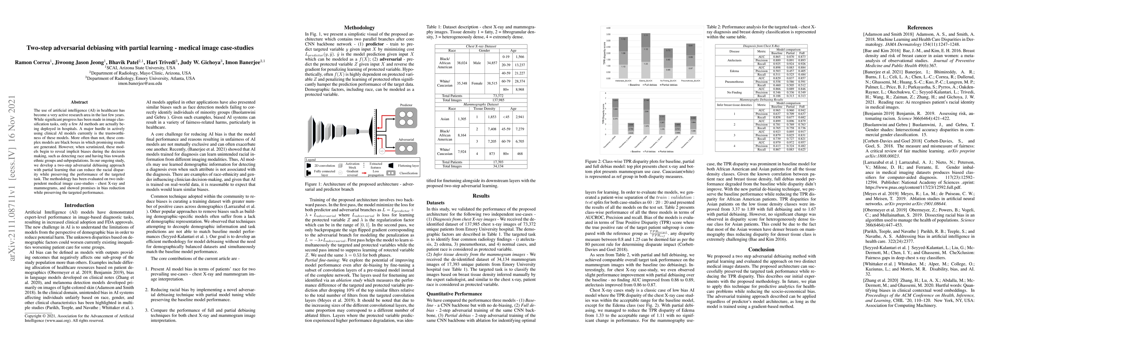 The use of artificial intelligence (AI) in healthcare has become a very active research area in the last few years. While significant progress has been made in image classification tasks, only a few AI methods are actually being deployed in hospitals. A major hurdle in actively using clinical AI models currently is the trustworthiness of these models. More often than not, these complex models are black boxes in which promising results are generated. However, when scrutinized, these models begin to reveal implicit biases during the decision making, such as detecting race and having bias towards ethnic groups and subpopulations. In our ongoing study, we develop a two-step adversarial debiasing approach with partial learning that can reduce the racial disparity while preserving the performance of the targeted task. The methodology has been evaluated on two independent medical image case-studies - chest X-ray and mammograms, and showed promises in bias reduction while preserving the targeted performance.