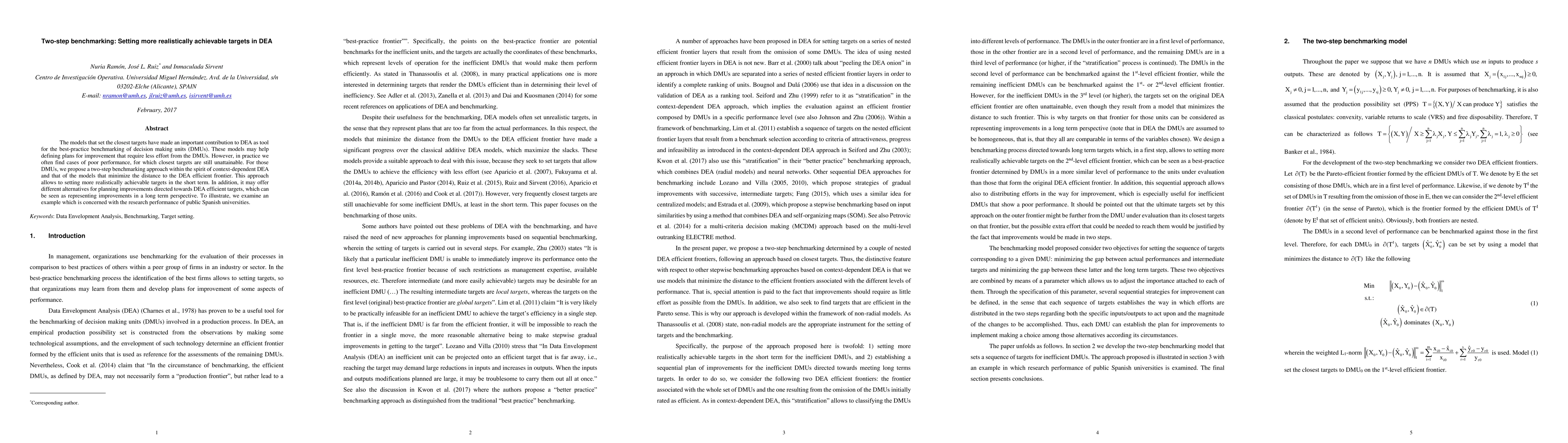 This paper proposes a two-step benchmarking approach to set more realistically achievable targets in Data Envelopment Analysis (DEA) for underperforming decision-making units (DMUs). It offers alternatives for short-term improvements and long-term efficiency goals, illustrated through an example of public Spanish universities' research performance.