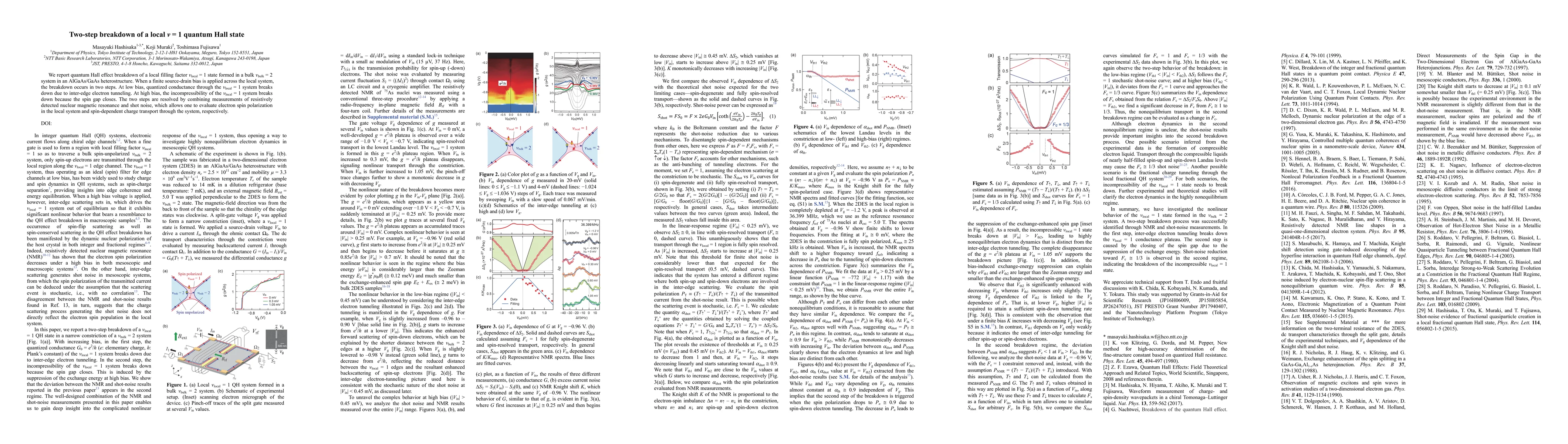 We report quantum Hall effect breakdown of a local filling factor v_local = 1 state formed in a bulk v_bulk = 2 system in an AlGaAs/GaAs heterostructure. When a finite source-drain bias is applied across the local system, the breakdown occurs in two steps. At low bias, quantized conductance through the v_local = 1 system breaks down due to inter-edge electron tunneling. At high bias, the incompressibility of the v_local = 1 system breaks down because the spin gap closes. The two steps are resolved by combining measurements of resistively detected nuclear magnetic resonance and shot noise, which allows one to evaluate electron spin polarization in the local system and spin-dependent charge transport through the system, respectively.