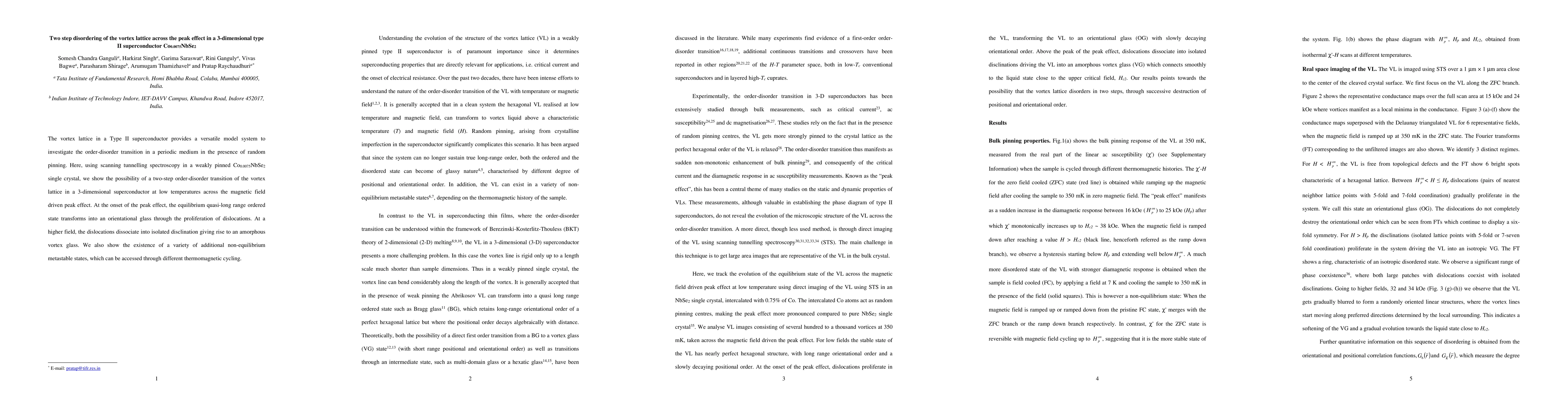 Summary: This study reveals a two-step disordering process in the vortex lattice of the weakly pinned superconductor Co0.0075NbSe2, showing first an orientational glass via dislocation proliferation and then an amorphous vortex glass through disclination formation, observed via scanning tunnelling spectroscopy. Various non-equilibrium metastable states are also identified through thermomagnetic cycling.