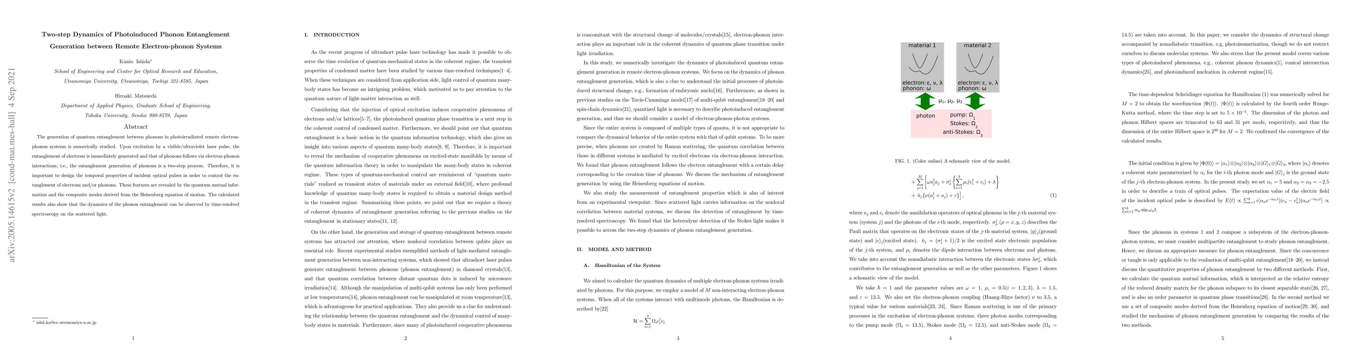The generation of quantum entanglement between phonons in photoirradiated remote electron-phonon systems is numerically studied. Upon excitation by a visible/ultraviolet laser pulse, the entanglement of electrons is immediately generated and that of phonons follows via electron-phonon interactions, i.e., the entanglement generation of phonons is a two-step process. Therefore, it is important to design the temporal properties of incident optical pulses in order to control the entanglement of electrons and/or phonons. These features are revealed by the quantum mutual information and the composite modes derived from the Heisenberg equation of motion. The calculated results also show that the dynamics of the phonon entanglement can be observed by time-resolved spectroscopy on the scattered light.