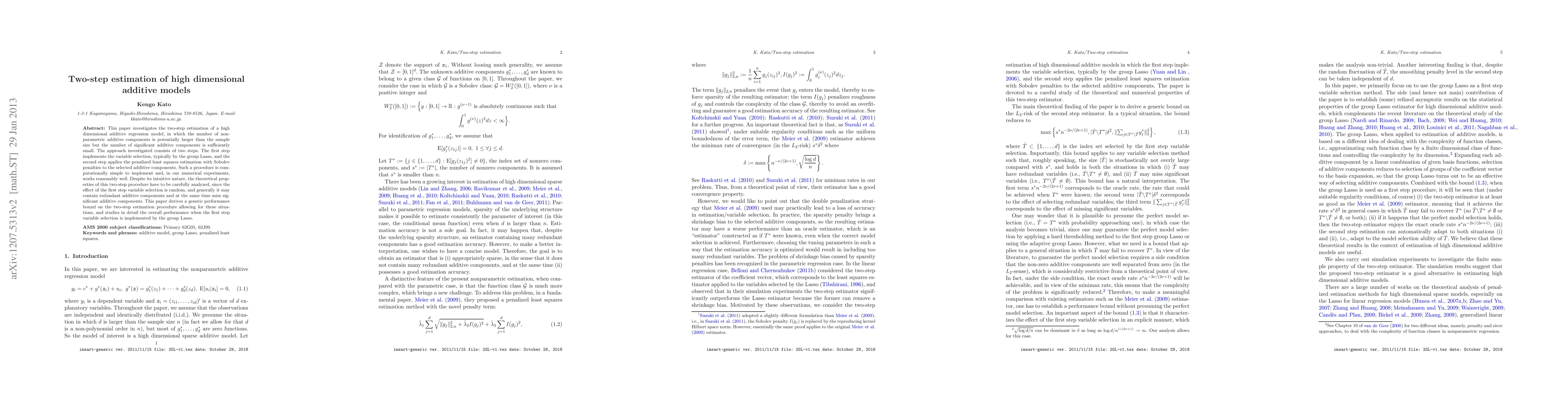 This paper investigates the two-step estimation of a high dimensional additive regression model, in which the number of nonparametric additive components is potentially larger than the sample size but the number of significant additive components is sufficiently small. The approach investigated consists of two steps. The first step implements the variable selection, typically by the group Lasso, and the second step applies the penalized least squares estimation with Sobolev penalties to the selected additive components. Such a procedure is computationally simple to implement and, in our numerical experiments, works reasonably well. Despite its intuitive nature, the theoretical properties of this two-step procedure have to be carefully analyzed, since the effect of the first step variable selection is random, and generally it may contain redundant additive components and at the same time miss significant additive components. This paper derives a generic performance bound on the two-step estimation procedure allowing for these situations, and studies in detail the overall performance when the first step variable selection is implemented by the group Lasso.