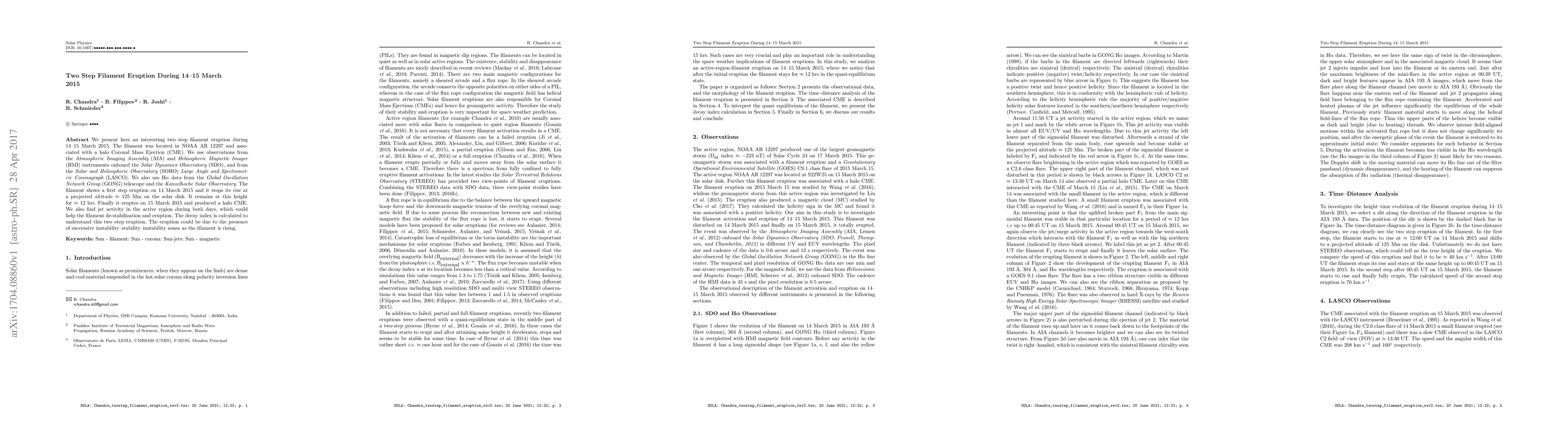 We present here an interesting two-step filament eruption during 14-15 March 2015. The filament was located in NOAA AR 12297 and associated with a halo Coronal Mass Ejection (CME). We use observations from the Atmospheric Imaging Assembly (AIA) and Heliospheric Magnetic Imager (HMI) instruments onboard the Solar Dynamics Observatory (SDO), and from the Solar and Heliospheric Observatory (SOHO) Large Angle and Spectrometric Coronagraph (LASCO). We also use H-alpha data from the Global Oscillation Network Group (GONG) telescope and the Kanzelhoehe Solar Observatory. The filament shows a first step eruption on 14 March 2015 and it stops its rise at a projected altitude ~ 125 Mm on the solar disk. It remains at this height for ~ 12 hrs. Finally it eruptes on 15 March 2015 and produced a halo CME. We also find jet activity in the active region during both days, which could help the filament de-stabilization and eruption. The decay index is calculated to understand this two-step eruption. The eruption could be due to the presence of successive instability-stability-instability zones as the filament is rising.