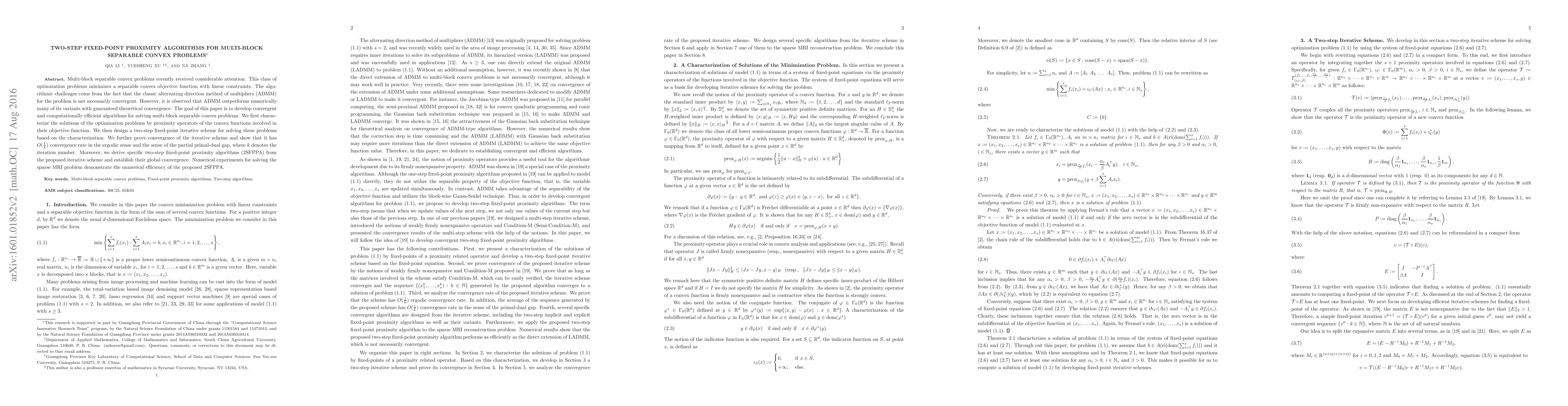 This paper develops convergent and efficient algorithms for solving multi-block separable convex optimization problems, proposing a two-step fixed-point proximity algorithm (2SFPPA) with O(1/k) convergence rate. Numerical experiments show the effectiveness of the proposed method in solving the sparse MRI problem.