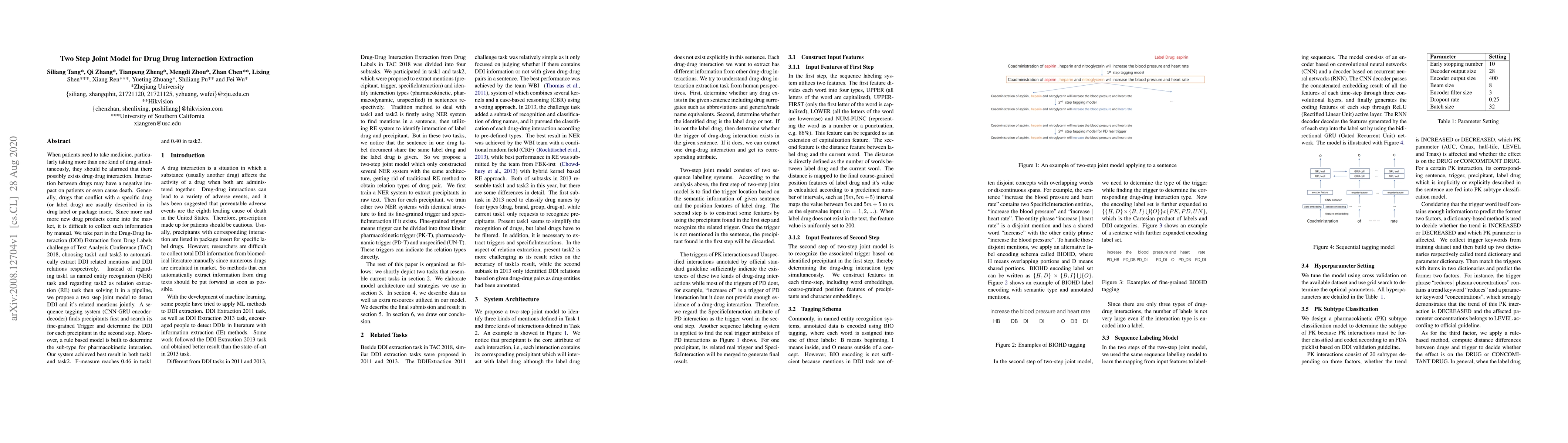 When patients need to take medicine, particularly taking more than one kind of drug simultaneously, they should be alarmed that there possibly exists drug-drug interaction. Interaction between drugs may have a negative impact on patients or even cause death. Generally, drugs that conflict with a specific drug (or label drug) are usually described in its drug label or package insert. Since more and more new drug products come into the market, it is difficult to collect such information by manual. We take part in the Drug-Drug Interaction (DDI) Extraction from Drug Labels challenge of Text Analysis Conference (TAC) 2018, choosing task1 and task2 to automatically extract DDI related mentions and DDI relations respectively. Instead of regarding task1 as named entity recognition (NER) task and regarding task2 as relation extraction (RE) task then solving it in a pipeline, we propose a two step joint model to detect DDI and it's related mentions jointly. A sequence tagging system (CNN-GRU encoder-decoder) finds precipitants first and search its fine-grained Trigger and determine the DDI for each precipitant in the second step. Moreover, a rule based model is built to determine the sub-type for pharmacokinetic interation. Our system achieved best result in both task1 and task2. F-measure reaches 0.46 in task1 and 0.40 in task2.