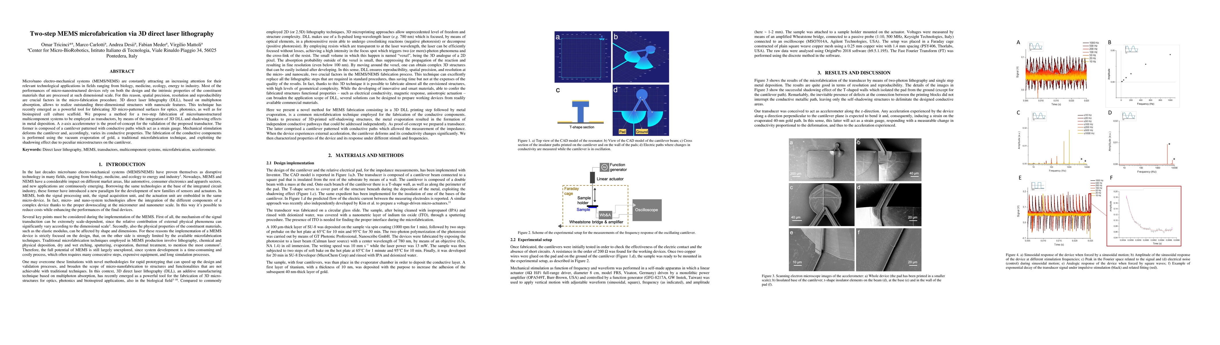 Micro/nano electro-mechanical systems (MEMS/NEMS) are constantly attracting an increasing attention for their relevant technological applications in fields ranging from biology, medicine, ecology, energy to industry. Most of the performances of micro-nanostructured devices rely on both the design and the intrinsic properties of the constituent materials that are processed at such dimensional scale. For this reason, spatial precision, resolution and reproducibility are crucial factors in the micro-fabrication procedure. 3D direct laser lithography (DLL), based on multiphoton absorption, allows to realize outstanding three-dimensional structures with nanoscale features. This technique has recently emerged as a powerful tool for fabricating 3D micro-patterned surfaces for optics, photonics, as well as for bioinspired cell culture scaffold. We propose a method for a two-step fabrication of micro/nanostructured multicomponent systems to be employed as transductors, by means of the integration of 3D DLL and shadowing effects in metal deposition. A z-axis accelerometer is the proof-of-concept for the validation of the proposed transductor. The former is composed of a cantilever patterned with conductive paths which act as a strain gauge. Mechanical stimulation deforms the cantilever and, accordingly, varies its conductive properties. The fabrication of the conductive components is performed using the vacuum evaporation of gold, a traditional microfabrication technique, and exploiting the shadowing effect due to peculiar microstructures on the cantilever.