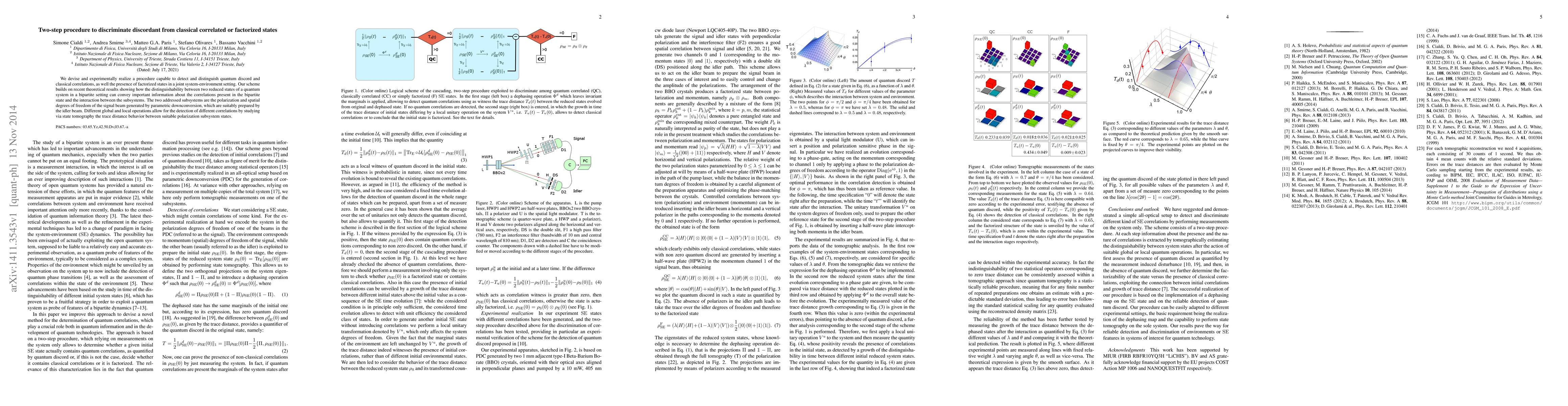 We devise and experimentally realize a procedure capable of detecting and distinguishing quantum discord and classical correlations as well the presence of factorized states in a joint system-environment setting. Our scheme builds on recent theoretical results showing how the distinguishability between two reduced states of a quantum system in a bipartite setting can convey important information about the correlations present in the bipartite state and the interaction between the subsystems. The two addressed subsystems are the polarization and spatial degrees of freedom of the signal beam generated by parametric down-conversion, which are suitably prepared by the idler beam. Different global and local operations allow for the detection of different correlations by studying via state tomography the trace distance behavior between suitable polarization subsystem states.
