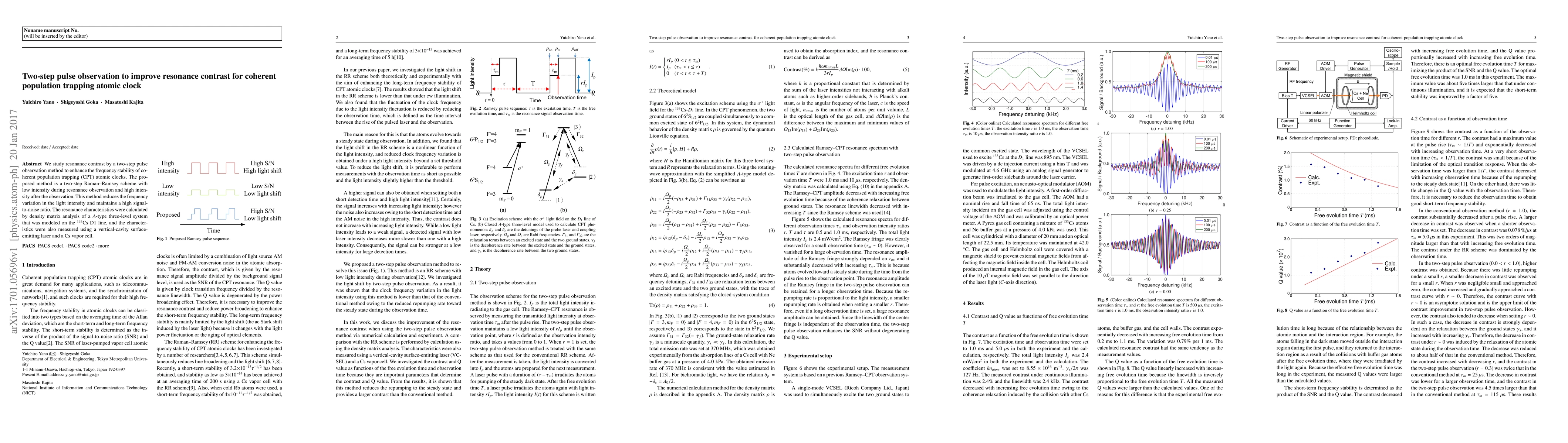 We study resonance contrast by a two-step pulse observation method to enhance the frequency stability of coherent population trapping (CPT) atomic clocks. The proposed method is a two-step Raman--Ramsey scheme with low intensity during resonance observation and high intensity after the observation. This method reduces the frequency variation in the light intensity and maintains a high signal-to-noise ratio. The resonance characteristics were calculated by density matrix analysis of a $\Lambda$-type three-level system that was modeled on the $^{133}$Cs D1 line, and the characteristics were also measured using a vertical-cavity surface-emitting laser and a Cs vapor cell.