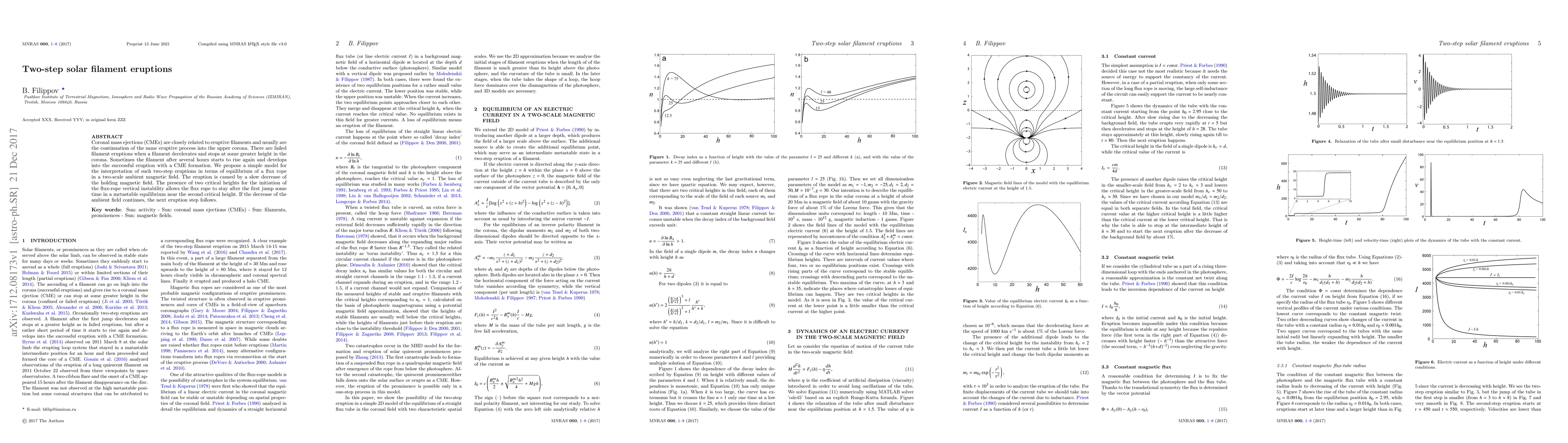 This paper proposes a model explaining two-step solar filament eruptions, where filaments initially decelerate and stop but later resume rising and culminate in coronal mass ejections. The model attributes these phenomena to the equilibrium of a flux rope in a two-scale magnetic field, with the eruption triggered by the gradual weakening of the holding magnetic field.