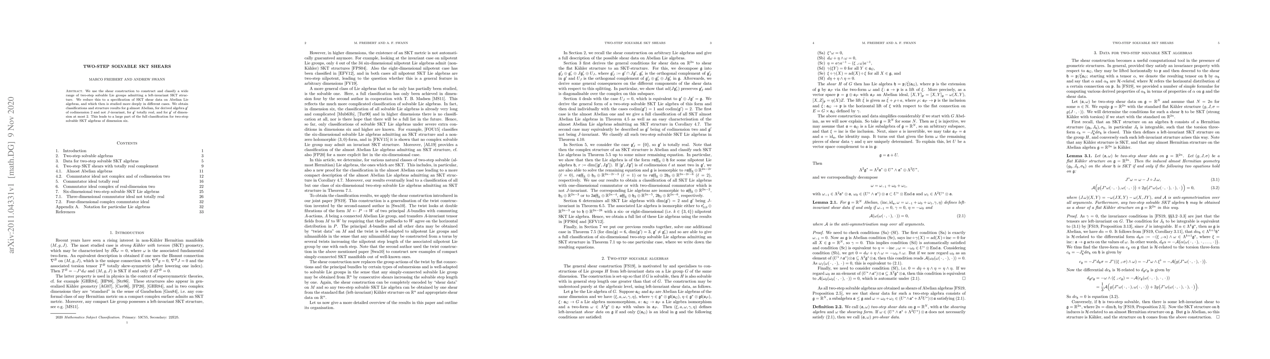 This paper constructs and classifies two-step solvable Lie groups with left-invariant SKT structures, reducing the problem to SKT shear data on Abelian Lie algebras, and provides detailed classifications for various algebraic structures. The study leads to significant results in classifying two-step solvable SKT algebras of dimension six.