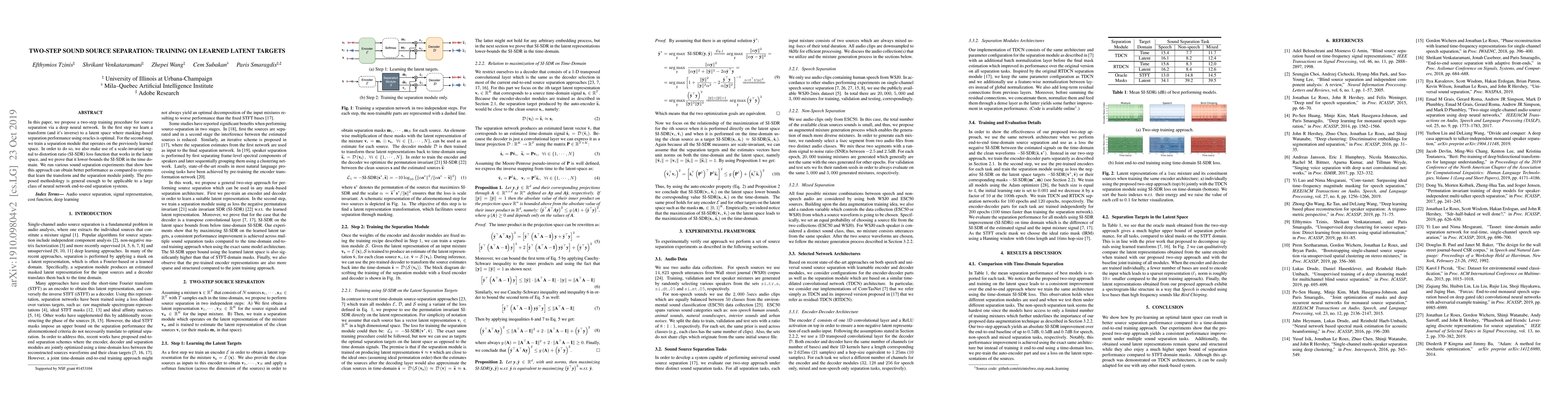 This paper proposes a two-step training method for deep neural networks in sound source separation, first learning a latent space for optimal separation, then training a separation module in this space using a scale-invariant loss function. Experiments show improved performance over joint training methods.