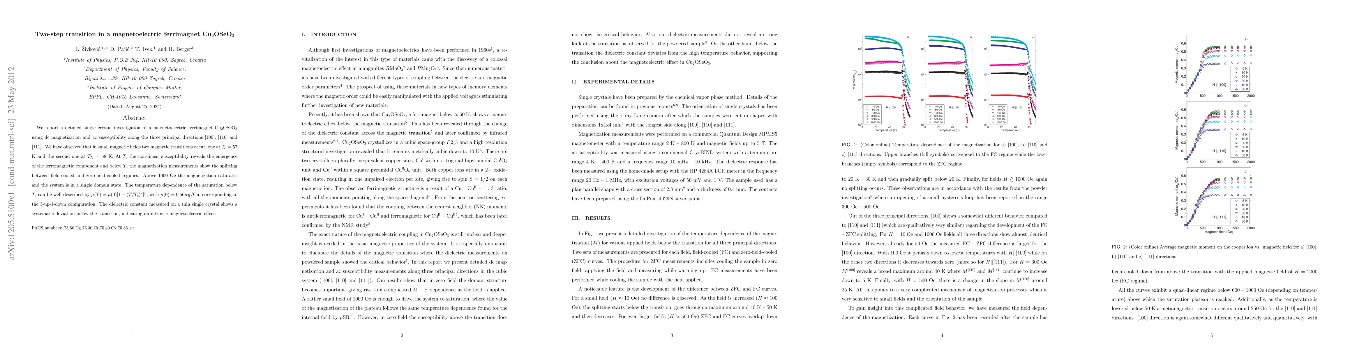We report a detailed single crystal investigation of a magnetoelectric ferrimagnet Cu2OSeO3 using dc magnetization and ac susceptibility along the three principal directions [100], [110] and [111]. We have observed that in small magnetic fields two magnetic transitions occur, one at Tc = 57 K and the second one at TN = 58 K. At Tc the non-linear susceptibility reveals the emergence of the ferromagnetic component and below Tc the magnetization measurements show the splitting between field-cooled and zero-field-cooled regimes. Above 1000 Oe the magnetization saturates and the system is in a single domain state. The temperature dependence of the saturation below Tc can be well described by m(T) = m(0)[1 - (T/Tc)^2]^{\beta}, with m(0) = 0.56 (mu)B/Cu, corresponding to the 3-up-1-down configuration. The dielectric constant measured on a thin single crystal shows a systematic deviation below the transition, indicating an intrinsic magnetoelectric effect.