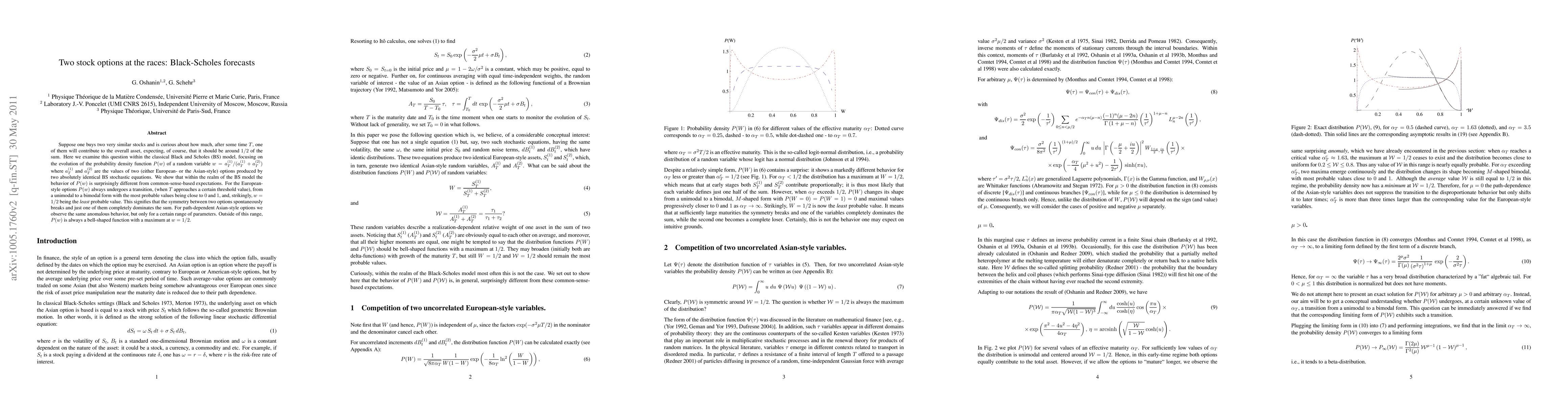 Suppose one buys two very similar stocks and is curious about how much, after some time T, one of them will contribute to the overall asset, expecting, of course, that it should be around 1/2 of the sum. Here we examine this question within the classical Black and Scholes (BS) model, focusing on the evolution of the probability density function P(w) of a random variable w = a_T^{(1)}/(a_T^{(1)} + a_T^{(2)}) where a_T^{(1)} and a_T^{(2)} are the values of two (either European- or the Asian-style) options produced by two absolutely identical BS stochastic equations. We show that within the realm of the BS model the behavior of P(w) is surprisingly different from common-sense-based expectations. For the European-style options P(w) always undergoes a transition, (when T approaches a certain threshold value), from a unimodal to a bimodal form with the most probable values being close to 0 and 1, and, strikingly, w =1/2 being the least probable value. This signifies that the symmetry between two options spontaneously breaks and just one of them completely dominates the sum. For path-dependent Asian-style options we observe the same anomalous behavior, but only for a certain range of parameters. Outside of this range, P(w) is always a bell-shaped function with a maximum at w = 1/2.