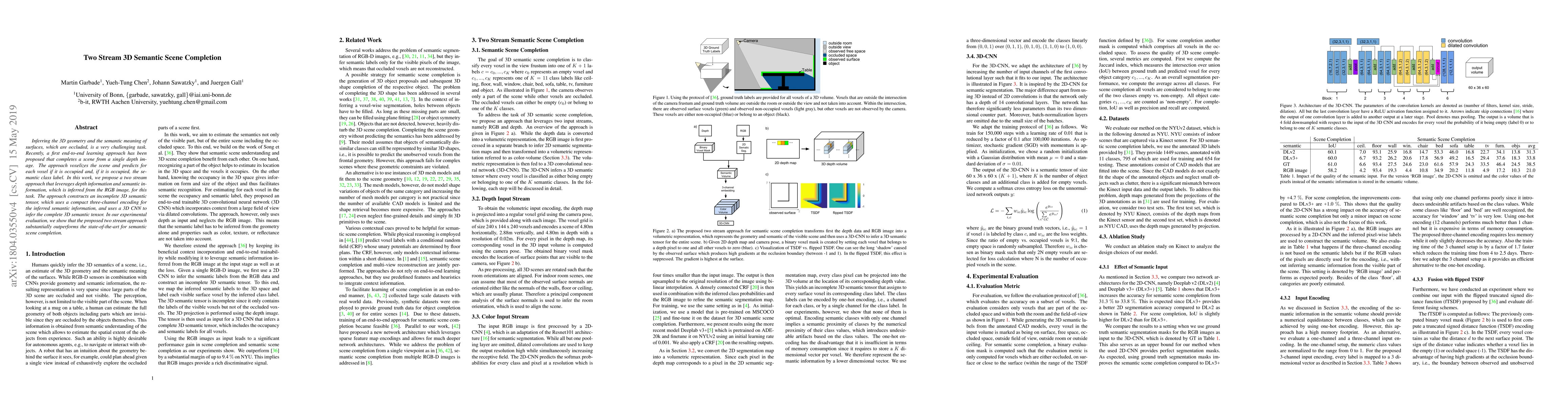 This paper proposes a two-stream approach for 3D semantic scene completion using depth and RGB information. It constructs an incomplete 3D semantic tensor and uses a 3D CNN to infer the complete tensor, outperforming existing methods.