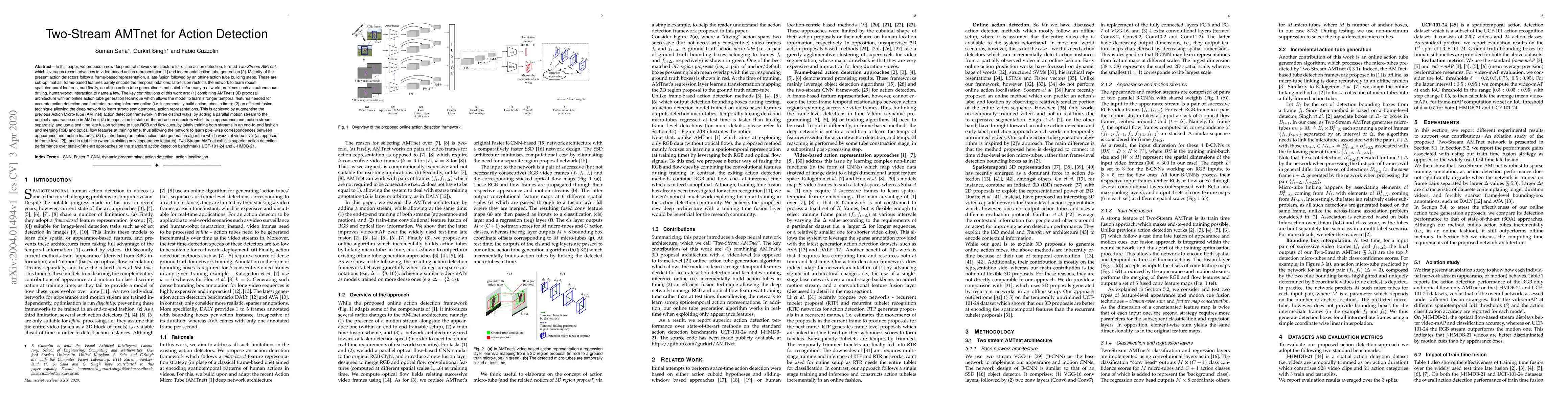 In this paper, we propose Two-Stream AMTnet, which leverages recent advances in video-based action representation[1] and incremental action tube generation[2]. Majority of the present action detectors follow a frame-based representation, a late-fusion followed by an offline action tube building steps. These are sub-optimal as: frame-based features barely encode the temporal relations; late-fusion restricts the network to learn robust spatiotemporal features; and finally, an offline action tube generation is not suitable for many real-world problems such as autonomous driving, human-robot interaction to name a few. The key contributions of this work are: (1) combining AMTnet's 3D proposal architecture with an online action tube generation technique which allows the model to learn stronger temporal features needed for accurate action detection and facilitates running inference online; (2) an efficient fusion technique allowing the deep network to learn strong spatiotemporal action representations. This is achieved by augmenting the previous Action Micro-Tube (AMTnet) action detection framework in three distinct ways: by adding a parallel motion stIn this paper, we propose a new deep neural network architecture for online action detection, termed ream to the original appearance one in AMTnet; (2) in opposition to state-of-the-art action detectors which train appearance and motion streams separately, and use a test time late fusion scheme to fuse RGB and flow cues, by jointly training both streams in an end-to-end fashion and merging RGB and optical flow features at training time; (3) by introducing an online action tube generation algorithm which works at video-level, and in real-time (when exploiting only appearance features). Two-Stream AMTnet exhibits superior action detection performance over state-of-the-art approaches on the standard action detection benchmarks.