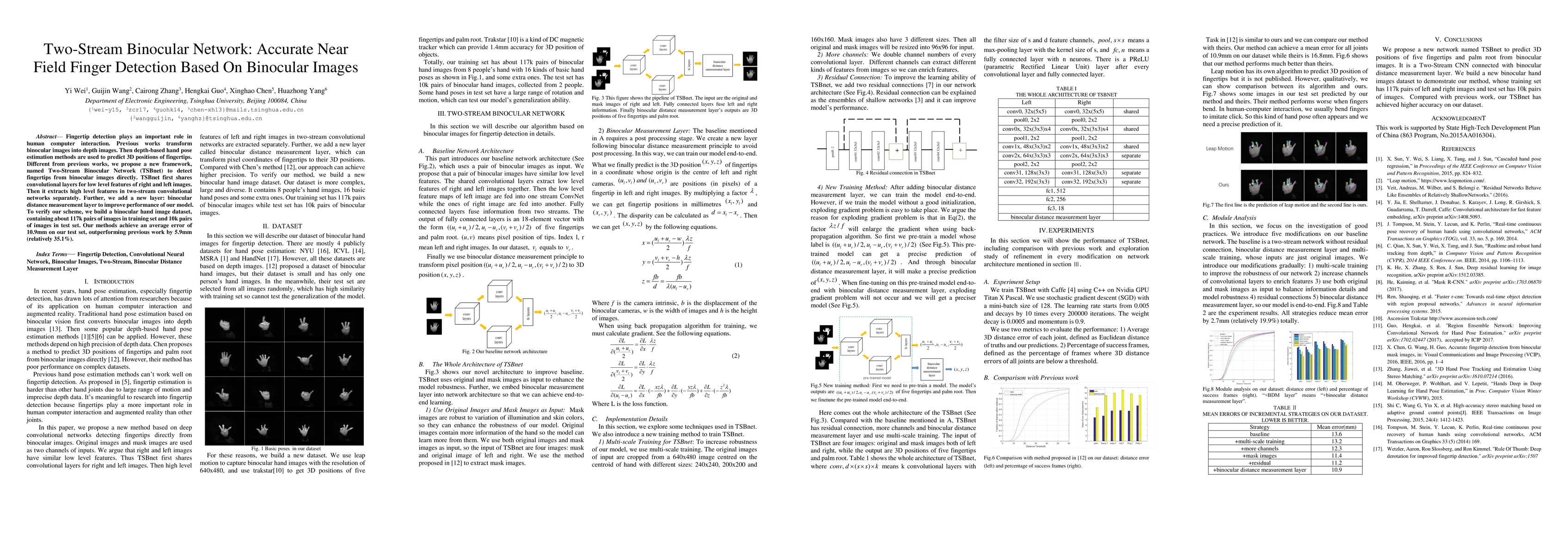 The paper proposes a Two-Stream Binocular Network (TSBnet) for accurate near-field fingertip detection from binocular images, achieving an average error of 10.9mm compared to previous depth-based methods, outperforming them by 5.9mm (35.1%). The framework shares convolutional layers for low-level features and uses separate streams for high-level features, supplemented by a binocular distance measurement layer.