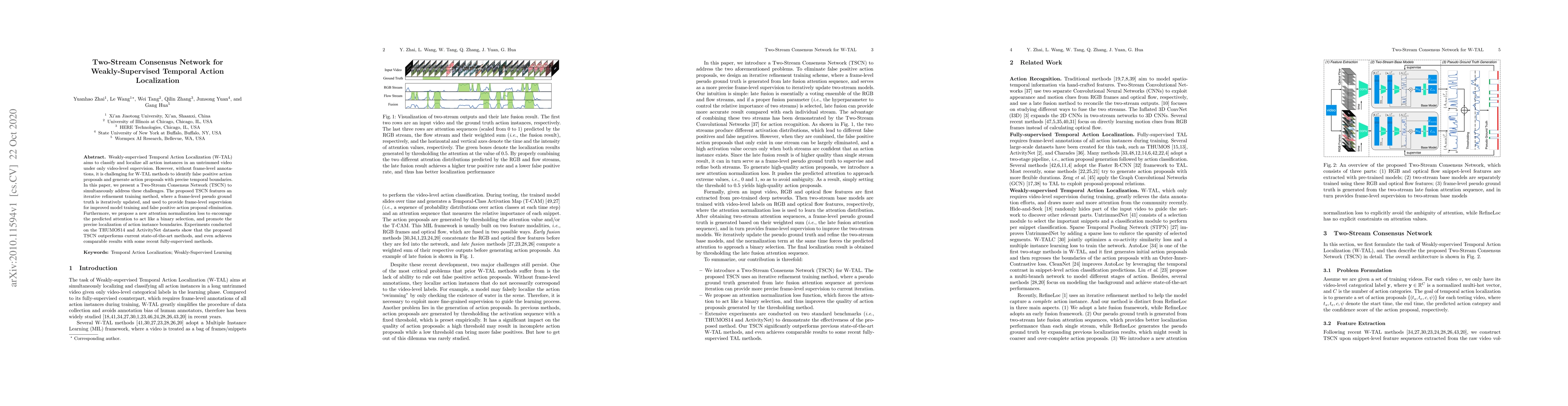 The paper introduces a Two-Stream Consensus Network (TSCN) for weakly-supervised temporal action localization, employing an iterative refinement training method to improve model accuracy and precise localization of action boundaries. The proposed method outperforms current state-of-the-art and achieves results comparable to fully-supervised methods on THUMOS14 and ActivityNet datasets.