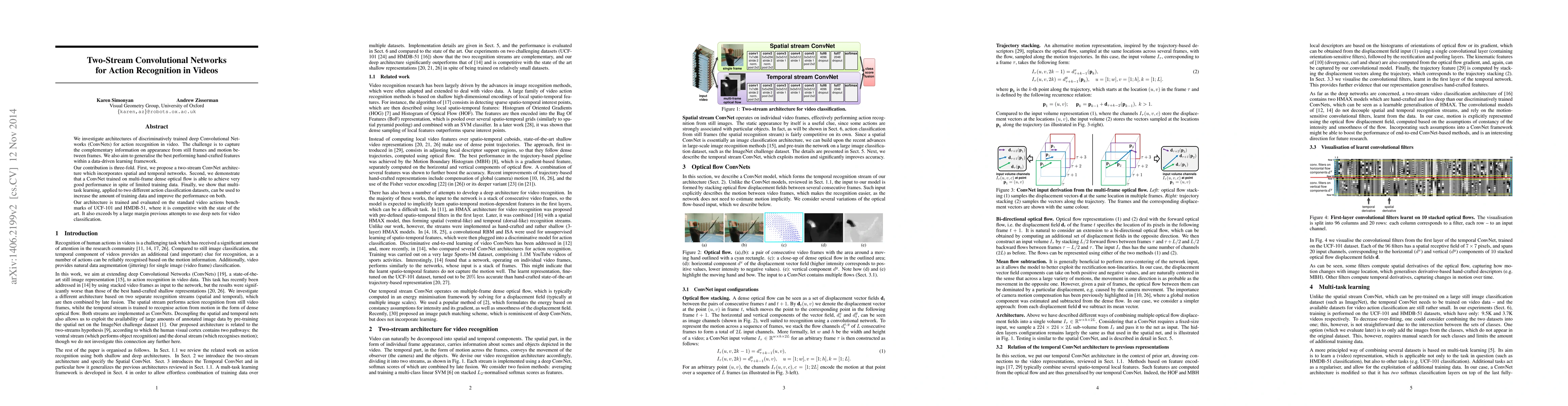 This paper proposes a two-stream ConvNet architecture to recognize actions in videos by capturing both spatial and temporal information from frames and optical flow. It demonstrates improved performance through multi-task learning and competitive results on UCF-101 and HMDB-51 benchmarks.