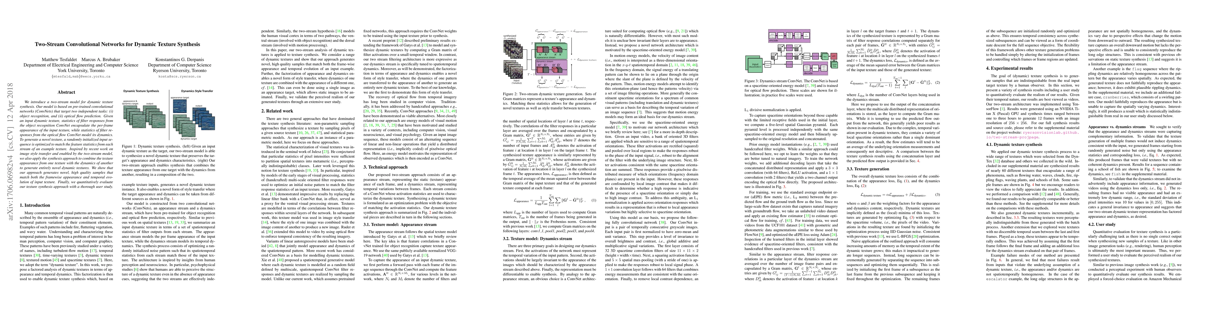 This paper proposes a two-stream convolutional network model for dynamic texture synthesis, utilizing object recognition and optical flow prediction to capture appearance and motion statistics. The model generates high-quality novel textures by matching feature statistics from both streams and can combine textures' appearance and dynamics for entirely new textures.