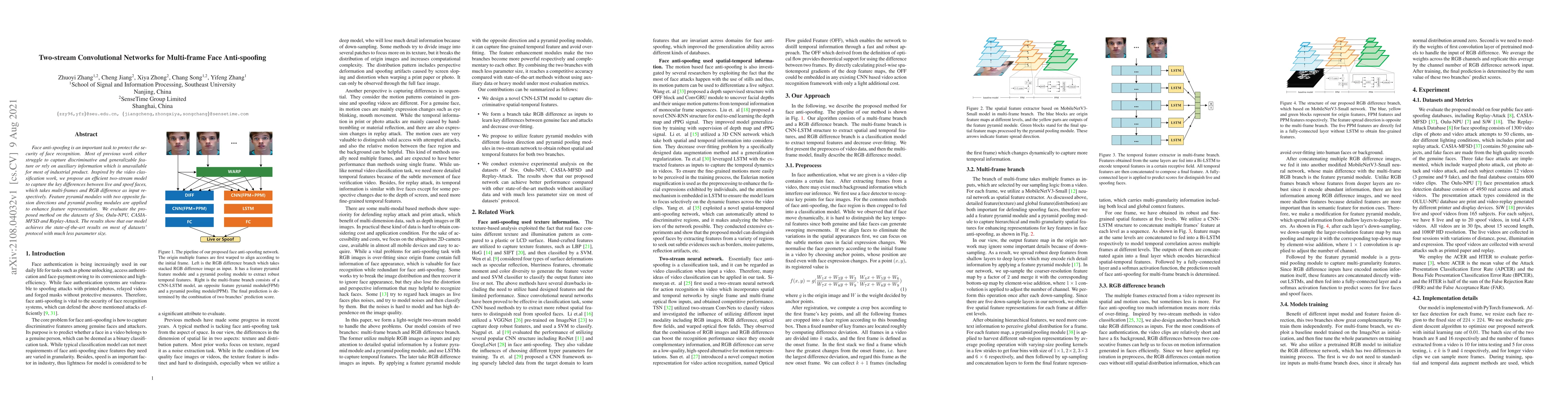 A new face anti-spoofing model uses a two-stream approach with feature pyramid modules to capture differences between live and spoof faces, achieving state-of-the-art results on multiple datasets while reducing parameter size.