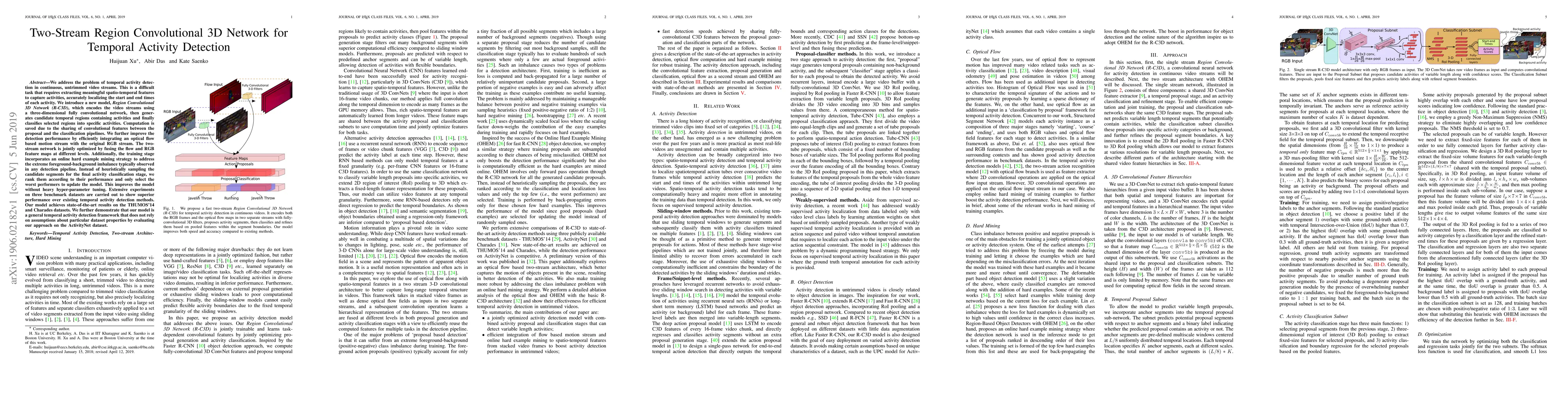 This paper proposes a Region Convolutional 3D Network (R-C3D) with a two-stream architecture to detect temporal activities in continuous video streams. The model combines an optical flow stream with RGB frames and uses an online hard example mining strategy to address dataset imbalance, achieving state-of-the-art performance on THUMOS'14, Charades, and ActivityNet datasets.
