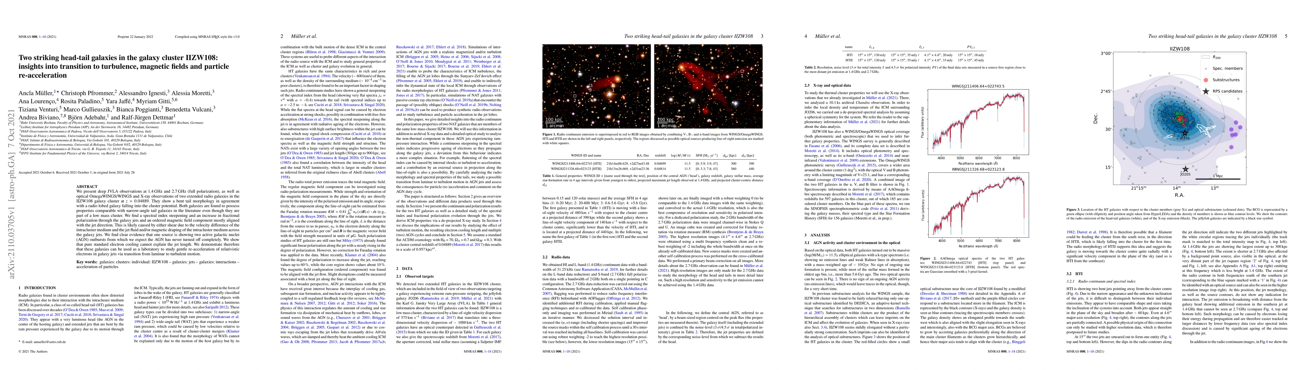 We present deep JVLA observations at 1.4 GHz and 2.7 GHz (full polarization), as well as optical OmegaWINGS/WINGS and X-ray observations of two extended radio galaxies in the IIZW108 galaxy cluster at z = 0.04889. They show a bent tail morphology in agreement with a radio lobed galaxy falling into the cluster potential. Both galaxies are found to possess properties comparable with {narrow-angle} tail galaxies in the literature even though they are part of a low mass cluster. We find a spectral index steepening and an increase in fractional polarization through the galaxy jets and an ordered magnetic field component mostly aligned with the jet direction. This is likely caused by either shear due to the velocity difference of the intracluster medium and the jet fluid and/or magnetic draping of the intracluster medium across the galaxy jets. We find clear evidence that one source is showing two active galactic nuclei (AGN) outbursts from which we expect the AGN has never turned off completely. We show that pure standard electron cooling cannot explain the jet length. We demonstrate therefore that these galaxies can be used as a laboratory to study gentle re-acceleration of relativistic electrons in galaxy jets via transition from laminar to turbulent motion.